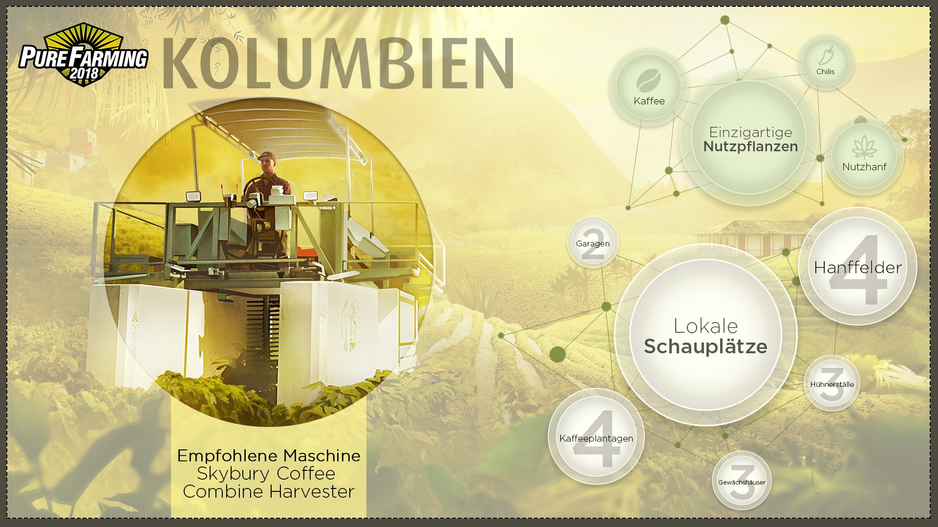 Während Simulations-Anfänger sowie -Experten in Japan beispielsweise Reis, Kirschen und Wasabi anbauen können, bietet Kolumbien hervorragende Voraussetzungen für den Anbau von Kaffee, Nutzhanf und Chilis. In den Anbaugebieten stehen Spielern außerdem spezialisierte Maschinen zur Verfügung, die für die Ernte von Weintrauben, Kaffee oder Reis entwickelt wurden. Auch das Vieh, das gehalten werden kann, unterscheidet sich von Region zu Region. Von Hotels über Kaffeeplantagen, von Reisfeldern bis hin zu Ställen und sogar einem aktiven Vulkan gibt es in jeder Region einzigartige Dinge zu entdecken.