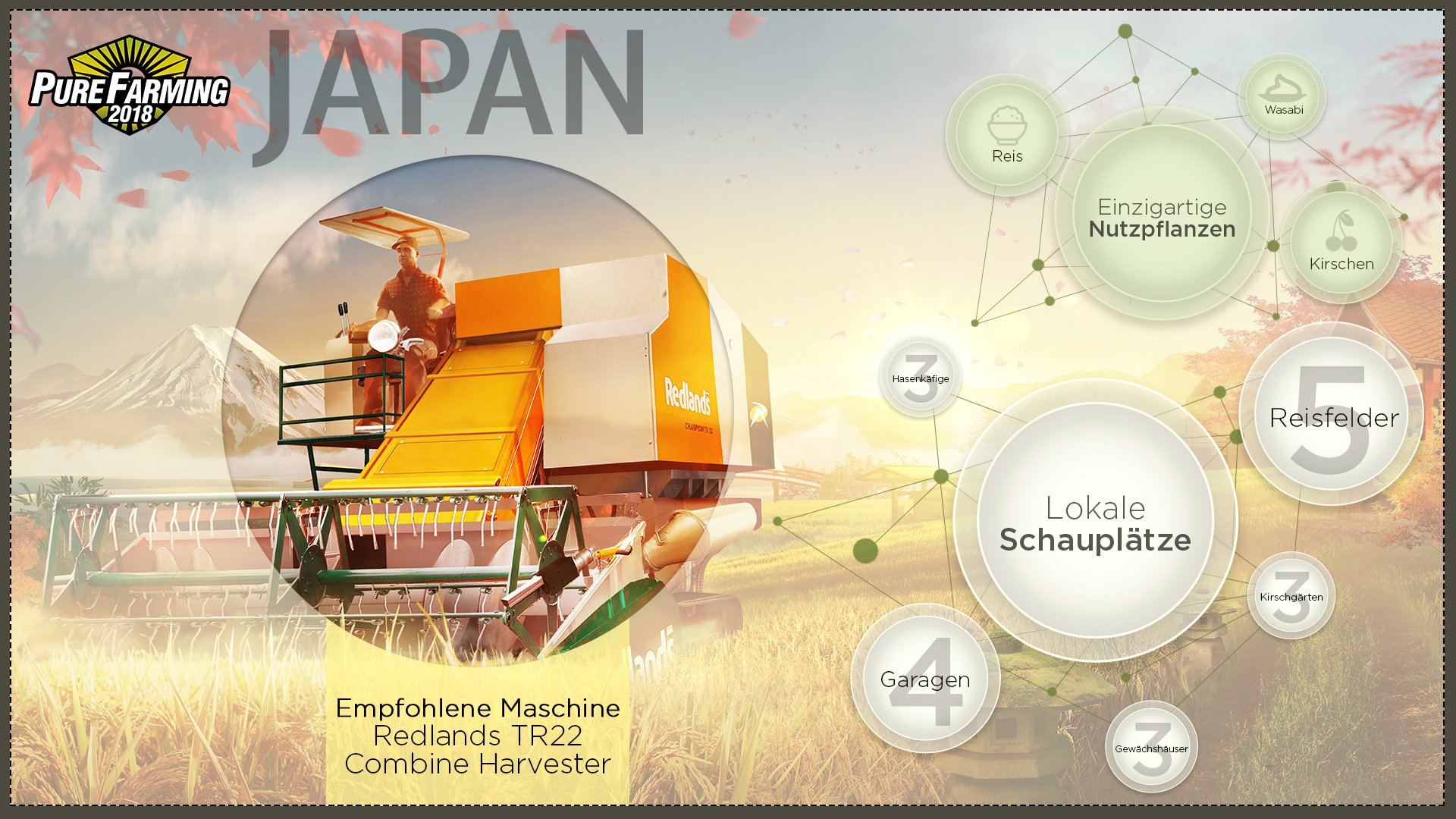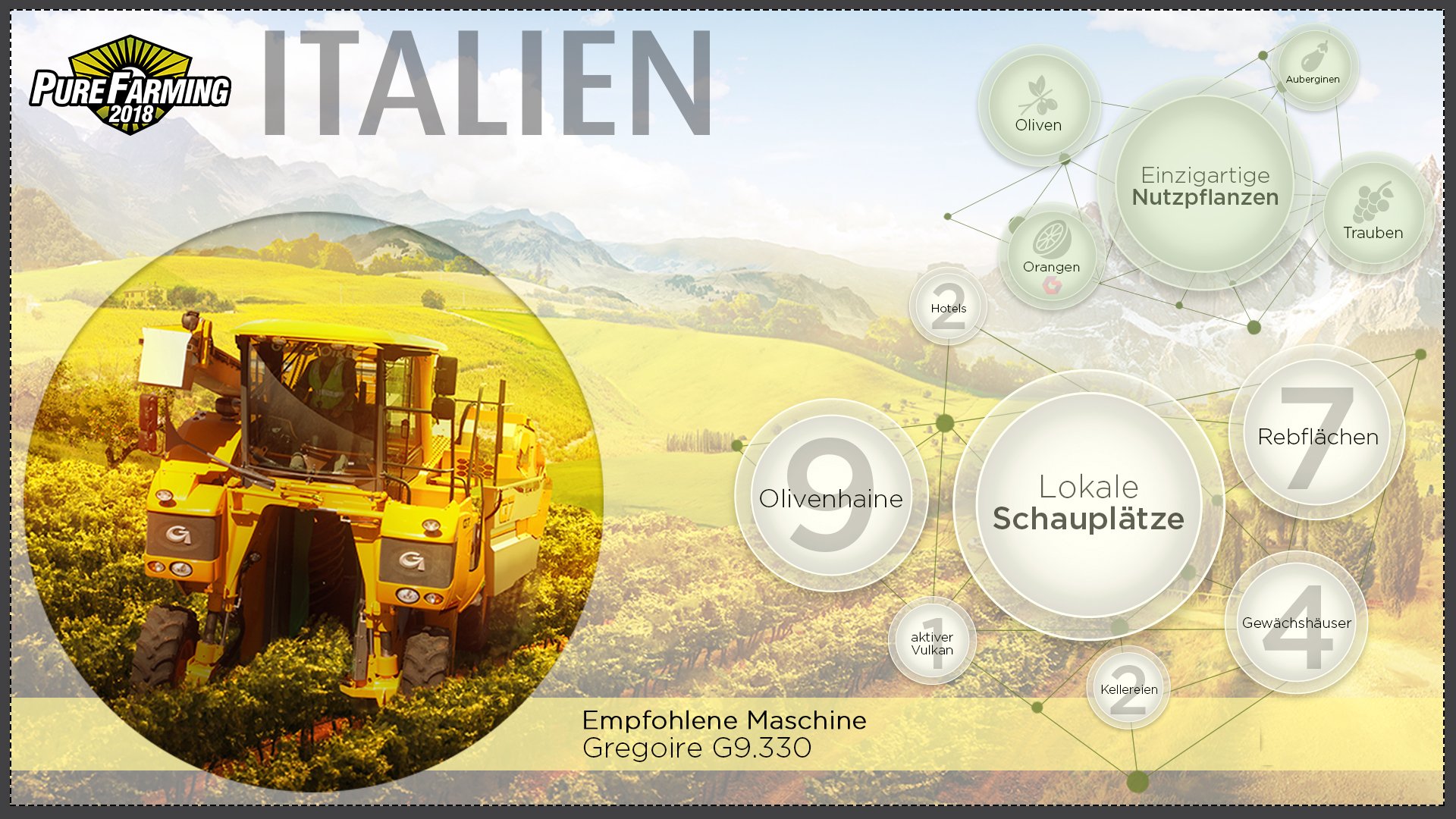 In der neuen Landwirtschafts-Simulation Pure Farming 2018 von Techland und Ice Flames warten eine Reihe interessanter Regionen. Die Gebiete von Montana, USA über Kolumbien, Italien, Deutschland bis nach Japan bieten unterschiedlichste Bedingungen für Spieler, die ihr eigenes Landwirtschafts-Imperium aufbauen wollen. Verschiedene Saatgüter, exklusive Spezialmaschinen und vielseitige Höfe machen den Aufbau der Betriebe in jedem Land zu einer ganz besonderen Herausforderung.