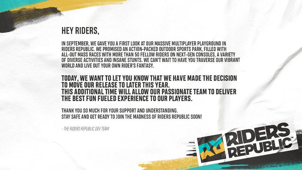 Nach "Hogwarths Legacy" verschiebt sich nun ein zweiter großer Titel nach hinten. Das Ubisoft Open World Sportspiel Riders Republic (ein Quasi-Nachfolger zu Steep) sollte ursprünglich am 25. Februar 2021 erscheinen. Via Twitter teilte Ubisoft nun mit, dass man mehr Zeit braucht, um den Titel weiter zu "polieren". Immerhin soll das Mountain-Bike-Spektakel Abfahrtsrennen für bis zu 50 Spieler auf der PS5 bieten. Neuer Termin ist: später im Jahr - was auch immer das heißen mag.