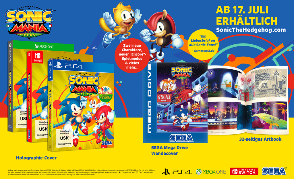 Sonic Mania Plus nimmt den Schwung von Sonic Mania auf und stellt zwei neue spielbare Charaktere aus Sonics‘ Vergangenheit vor: Mighty das Gürteltier und Ray das fliegende Eichhörnchen. Ein „Zugabe-Modus“ welcher bekannten Spiel-Abschnitten ein frisches Aussehen verleiht, bietet dank seinen überarbeiteten Verläufen neue Herausforderungen für sowohl neue Spieler als auch für Veteranen. Die Wettkampf- und Rennen-auf-Zeit-Modi erhalten ein Update, mit dem Vier-Spieler-Wettkämpfe und Geister-Herausforderungen für Zeit-Rennen ermöglicht werden. Dieses Gesamtpaket erscheint in einer komplett neuen physischen Edition, welche mit einem 32-seitigen Artbook für Sammler, einem Sega Mega Drive-Wendecover und einer holographischen Verpackung ausgestattet sein wird.