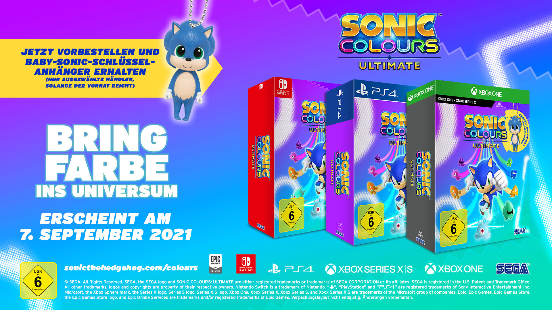 - Sonic Colors: Ultimate: das Update des Klassikers erscheint am 7. September für PS4 (Die Handelsversion enthält darüber hinaus einen exklusiven Baby-Sonic-Schlüsselanhänger.)