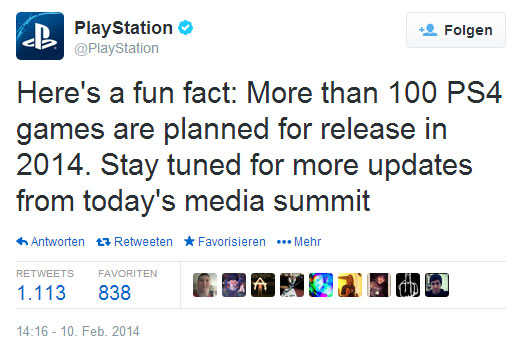 Sony muss es wissen! Auf Twitter verkündigte der Konsolenbauer nach einem Medienevent, dass in diesem Jahr mehr als 100 Spiele für die PS4 erscheinen sollen. Logisch das neben den Blockbustern auf Bluray auch Indiespiele gemeint sind.