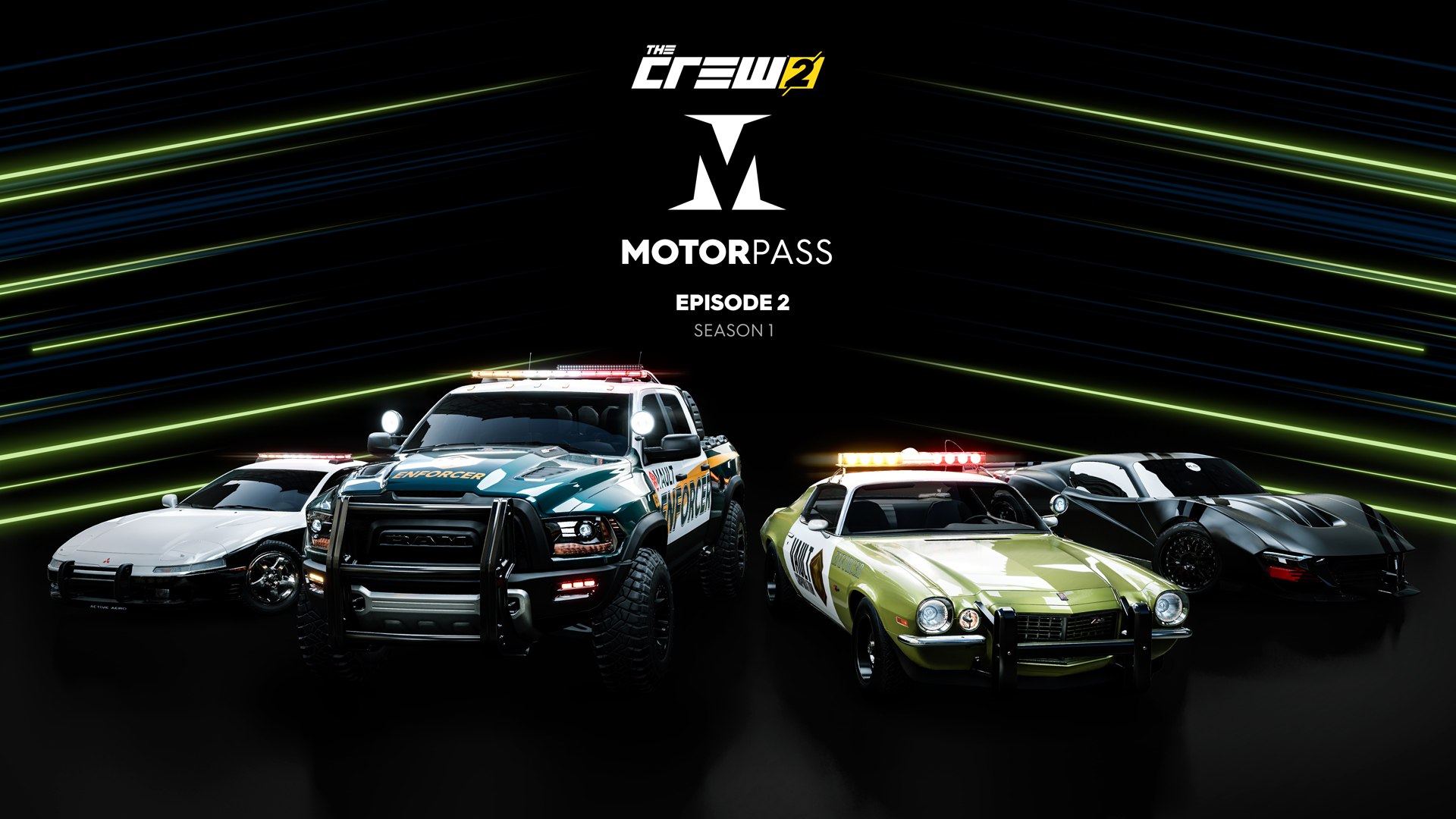 Episode 2: “Die Jagd“ bietet außerdem einen brandneuen Motorpass, das optionale mehrstufige Belohnungssystem, das sowohl kostenlose als auch Premium-Belohnungen bietet, darunter Fahrzeuge wie den K.S. Masked Leader (Hypercar), eine exklusive Kreation von Khyzyl Saleem, den RAM 1500 Rebel TRX Concept Enforcer Edition (Rally Raid), den Chevrolet Camaro Z/28 RS Enforcer Edition (Rally Cross) und den Mitsubishi 3000GT VR4 Interception Unit (Street Race). Vanity-Items, Outfits und Währungspakete sind ebenfalls enthalten.