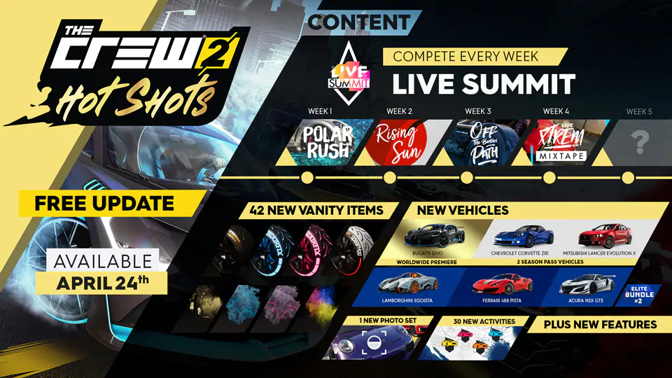 The Crew 2 erhält ein neues kostenloses Update namens "Hot Shots", dass neben zahlreichen Fehlern und Verbesserungen am eigentlichen Spiel, auch neue Fahrzeuge, Events, wöchentliche Veranstaltungen, neue Tuning-Sachen und die Möglichkeit, Performance Teile zu verschrotten und mit dem Schrott und Bucks die Boni der Performance Teile zu ändern.