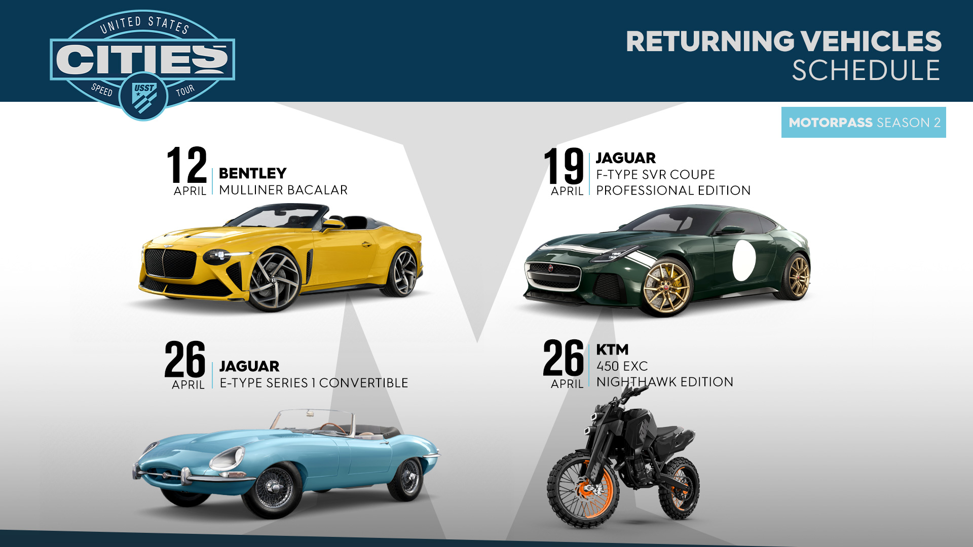 In Season 8 Episode 1 werden Fahrzeuge aus früheren Motorpässen in den Shop zurückkehren, so dass die Spieler diese Fahrzeuge mit Bucks oder CCs kaufen können. Die Fahrzeuge, die ihr Comeback feiern werden, sind der Bentley Mulliner Bacalar (Street Race), der Jaguar F-Type SVR Coupé Professional Edition (Street Race), der Jaguar E-Type Series 1 Convertible (Street Race) und das KTM 450 EXC Nighthawk Edition (Motorrad).