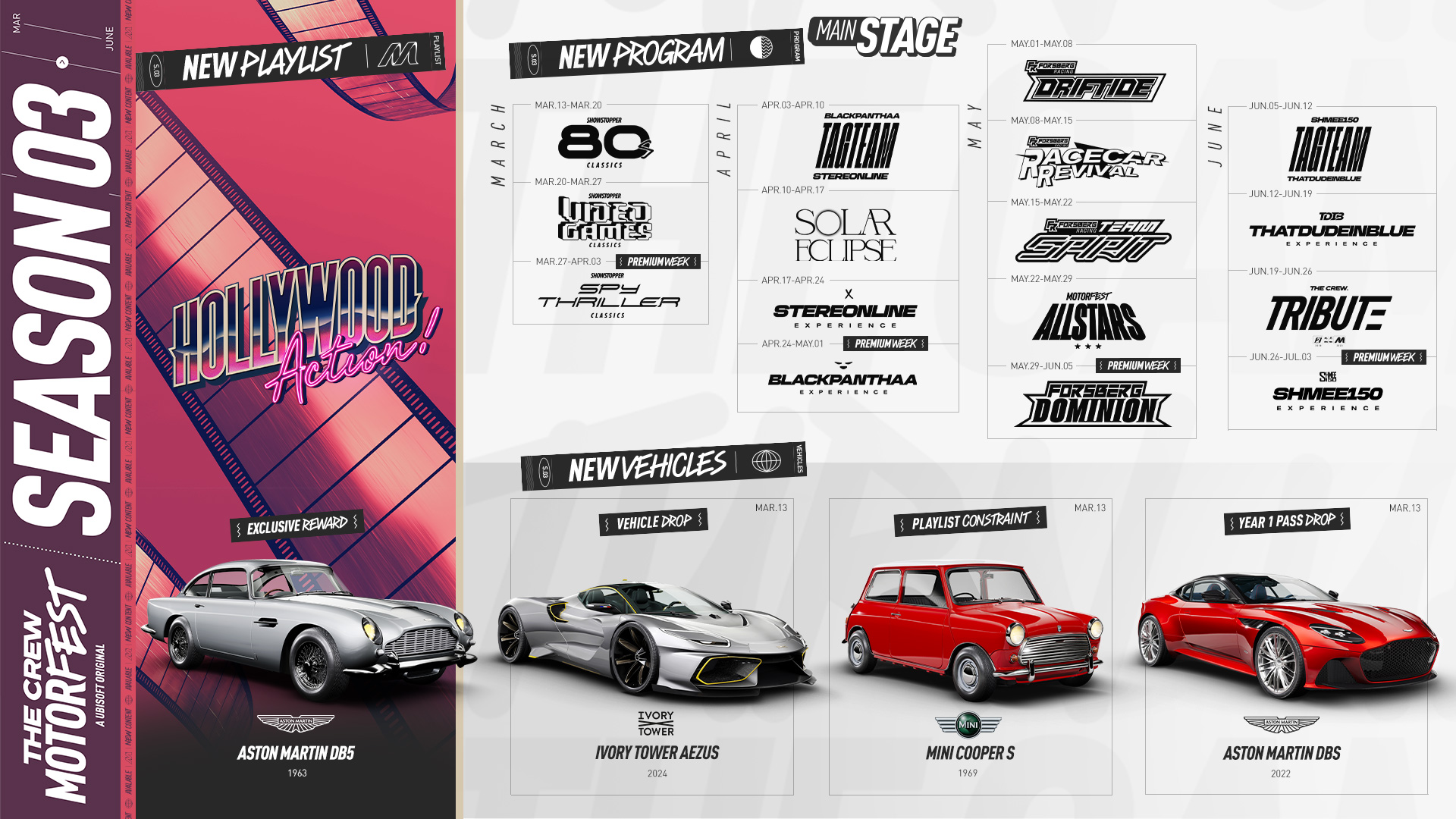 Eine Auswahl von 47 neuen Fahrzeugen, die entweder exklusiv für das The Crew Motorfest erhältlich sind oder aus The Crew 2 zurückkehren, wird hinzugefügt. Am 13. März können die Spieler den Porsche 911 Director's Cut Ed. (Street Tier 1), den Aston Martin DB5 (Street Tier 1) oder den einzigartigen Ivory Tower Aezus (Hypercar) fahren, die von Ubisoft Künstlern akribisch entworfen wurden.