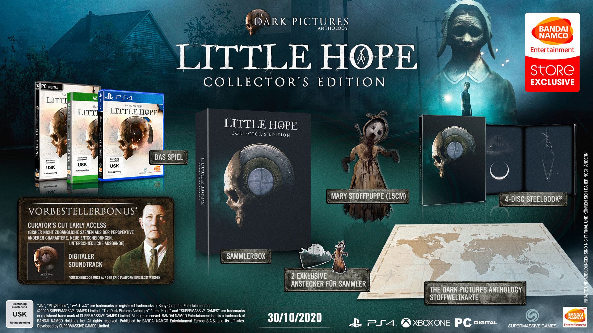 - Das Limited-Edition Bundle, das nur bei teilnehmenden Händlern erhältlich ist, beinhaltet die Spiele Little Hope und Man of Medan, eine Stoffkarte, zwei Sammler-Pins und ein Steelcase mit vier Fächern