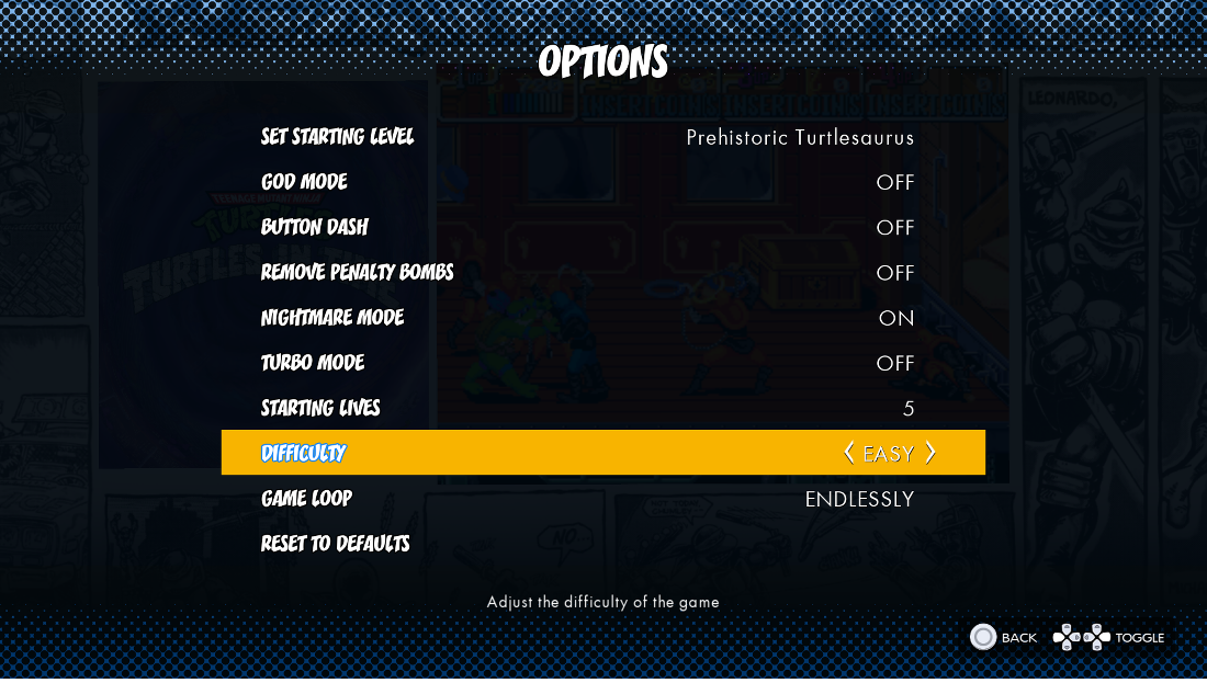 - Eine neue Verbesserung für Arcade US Turtles in Time. Die Anzahl der Leben pro Münze kann von 1-8 eingestellt werden.