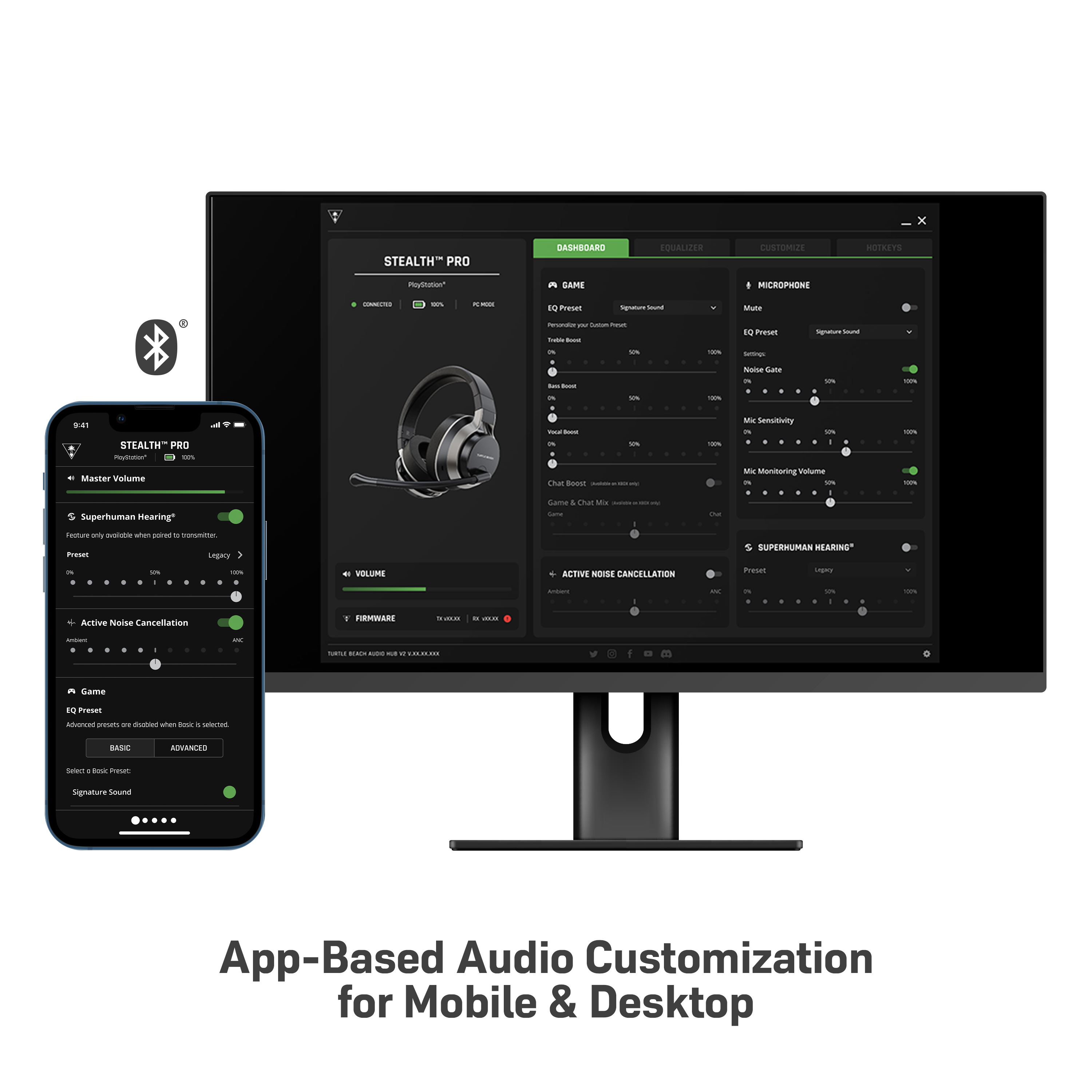 Spieler können nicht nur individuelle auf die Art des gespielten Spiels abgestimmte Audio-EQs erstellen, sondern auch die Mikrofonempfindlichkeit, Noise Gate, Mikrofon-Monitoring-Pegel und vieles mehr steuern – alles direkt über die Turtle Beach Audio Hub-App.