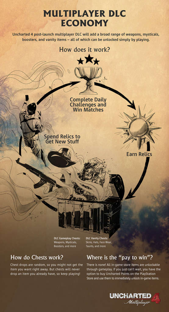 Im US-amerikanischen PlayStation Blog hat Robert Cogburn von Naughty Dog über den zünftigen Support des Multiplayer-Modus von Uncharted 4: A Thief`s End gesprochen und eine Roadmap veröffentlicht. Neben einer Flut von Waffen, Boostern, Skins, Karten und vielem mehr wird alles - KOSTENLOS sein, sprich man muss sich zwar Relikte durch tägl. Herausforderungen oder das Absolvieren von Matches verdienen, darf damit aber dann Schatzkisten öffnen, soll aber keine Duplikate erhalten. Somit kann man alles erspielen, ohne dafür zu bezahlen (Die Option gibt es aber trotzdem)! Dadurch wird die Community auch nicht fragmentiert (wie zum Beispiel bei Battlefield oder Call of Duty).