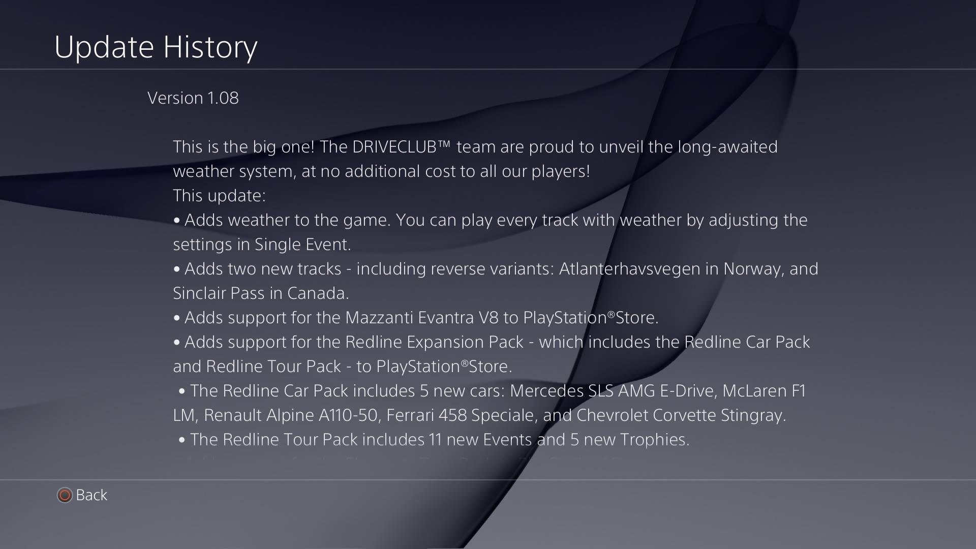Ab sofort könnt ihr euch das Wetter-Update für Driveclub herunterladen. Neben diversen Bugfixes und dem Wetter (kann man auf jeder Strecke nach Belieben einstellen) gibt es auch noch zwei neue Kurse in Norwegen / Kanada, sowie Support für die ersten DLCs ua. mit amerikanischen Autos. Zudem darf man endlich die Lackierungen auch offline bearbeiten / auswählen.