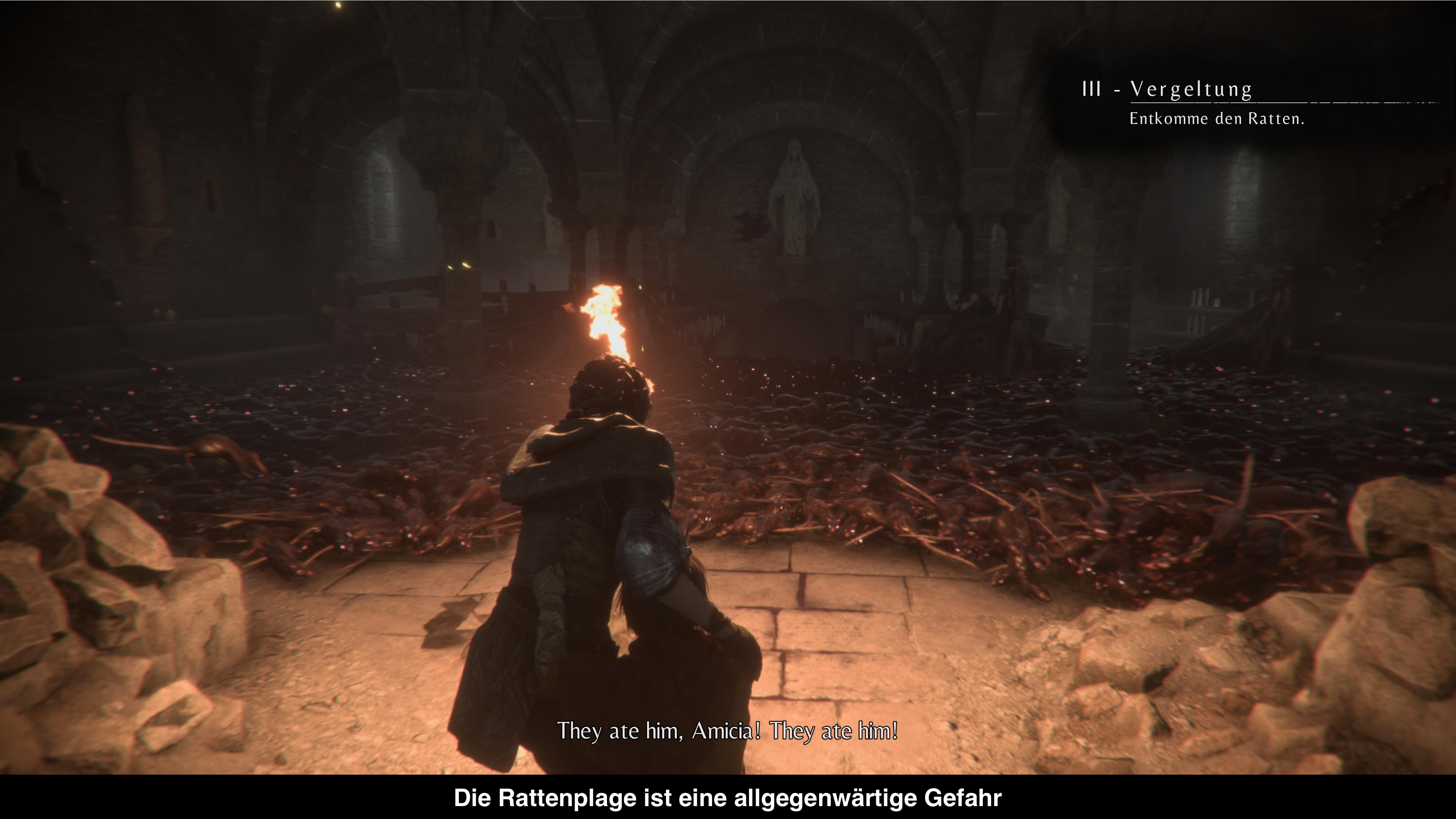 Die Geschichte von A Plague Tale: Innocence verschlägt euch in das Jahr 1349 im Süden Frankreichs. Hier übernehmt ihr die Rolle von Amicia de Rune, einer jungen Adligen, die mit ihrer Familie relativ in Frieden lebt. Ihr kleiner Bruder Hugo lebt aber relativ abgeschieden von der Familie, weil er von einer mysteriösen Krankheit geplagt wird. Doch die vermeintliche Idylle wird eines Tages gestört als die Inquisition vor der Haustür auftaucht und nach dem Bruder verlangt. Zu allem Übel tauchen überall Ratten auf, die alles zerfressen, was in ihre Finger kommt. Während das Anwesen der de Runes zerstört wird und alle Bewohner getötet werden, kann Amicia gerade so mit ihrem Bruder fliehen. So beginnt die interessante Geschichte um das Geschwisterpaar, die auf der Flucht so manche Gefahr überstehen müssen und gleichzeitig leidet Hugo zunehmend mehr an der Krankheit und ein Heilmittel ist nicht in Sicht. Und woher kommen all diese Ratten her? Diese Fragen treiben euch durch die Geschichte und sorgen für ein wirklich interessantes Szenario in einem halbwegs realistischen Mittelalter-Setting. Gegen Ende gibt es auch die ein oder andere spannende Wendung die für noch mehr Spannung sorgt.