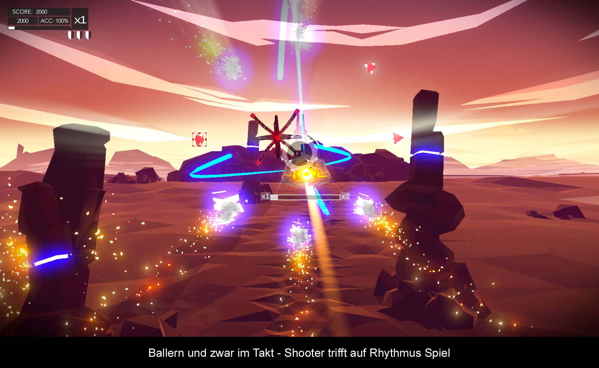 Das Wechselspiel zwischen den Baller- und Rhythmuspassagen ist eingängig und schnell erlernt. Das Spiel verfügt über eine solide Anzahl an Level, die allesamt in drei Schwierigkeitsgraden bespielbar sind. Um jedoch die härteren Modi freizuschalten, muss man zunächst in jedem Level möglichst viele Sterne erlangen, welche man durch präzise Fahrten entlang der Schleifen und dem erfolgreichen Beseitigen der Gegner erhält. Mir persönlich hat der Gameplay-Mix sehr gut gefallen. Die Jagd nach weiteren Sternen in den ausgefallenen Level motivierte mich bis zum Ende enorm. Was den Spielinhalt angeht, stößt man jedoch schnell an seine Grenzen. Sobald man alle Schwierigkeitsgrade freigeschaltet hat, kann man sich höchstens noch damit beschäftigen, sämtliche Geheimnisse in den Kursen zu finden, bei denen es sich um Objekte abseits von Raumschiffen handelt, die man während des Flugs abschießen kann. Ein paar Modi mehr wären wünschenswert gewesen. Immerhin gibt es wenigstens eine Online-Bestenliste, mit der man seinen Highscore mit anderen Zockern vergleichen kann. Was mich an Aaero jedoch überrascht hat ist der knackige Schwierigkeitsgrad, der bereits nach den ersten beiden Level ziemlich schnell anzieht. Und angesichts des von Beginn an schnellen Tempos, werden viele Kurse definitiv mehrere Versuche für sich beanspruchen. Immerhin gibt es noch einen Freerun-Modus, in dem man die Kurse auch ohne den Druck des Game Overs befahren kann.