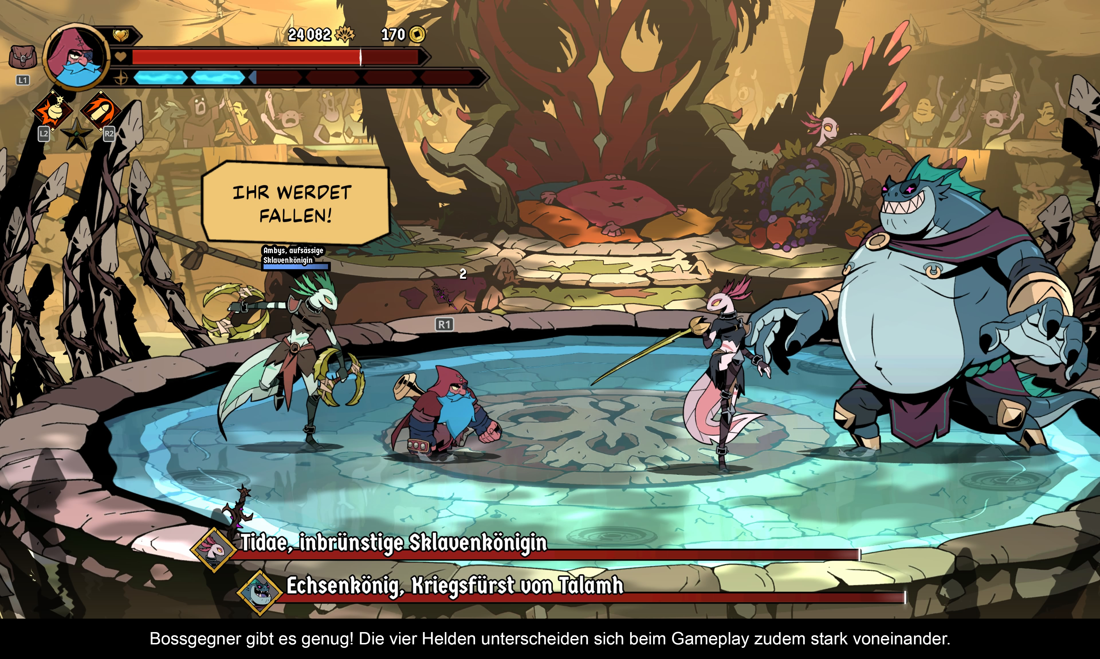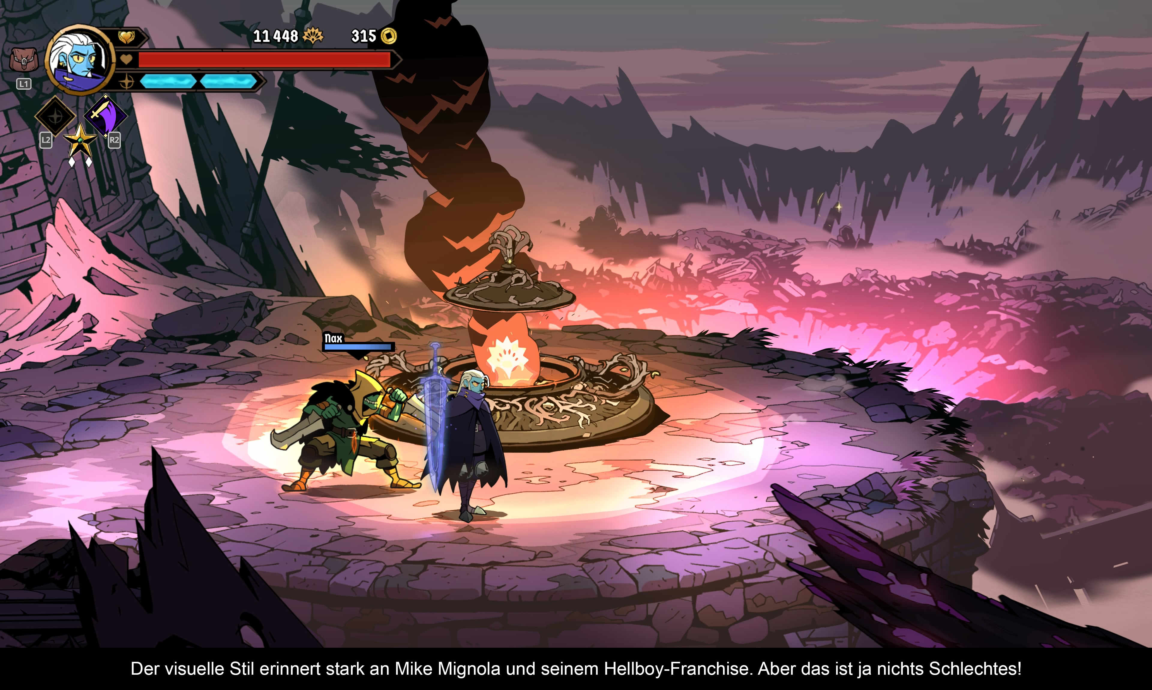 „Absolum“ wartet mit einem gelungenen, düsteren Cartoon-Stil auf. Mein erster Gedanke war: Das müssen Fans von Mike Mignolas „Hellboy“ sein. Denn die Gestaltung, die Farben und die Ästhetik sind eine regelrechte Verbeugung vor dem Indie-Comic-Meister! Aber auch sonst passen sie zur düsteren Geschichte und bieten dennoch reichlich Abwechslung. Die englische Sprachausgabe fügt sich ebenfalls toll in das Geschehen ein, und die Musik – mal melancholisch, mal aggressiv – passt jederzeit zur Bildschirm-Action. Das liegt auch daran, dass man eine ganze Reihe bekannter Komponisten wie Gareth Coker, Mick Gordon und Yuka Kitamura verpflichtet hat. Die deutschen Texte sind optimal lesbar und es gibt keine Schnitzer in der Qualität der Übersetzung. Obwohl es sich bei „Absolum“ um ein 2D-Abenteuer handelt, gibt es keine wirklich scrollenden Levels; vielmehr springt man von einem Bildschirm zum nächsten. Das tut dem Spielspaß jedoch keinen Abbruch, da Ladezeiten quasi nicht vorhanden sind und die Action jederzeit flüssig bleibt. Ruckler oder Tearing sucht man ebenso vergebens wie PSSR-Artefakte. Einzig die animierten Zwischensequenzen hätten eine höhere Bitrate vertragen können.