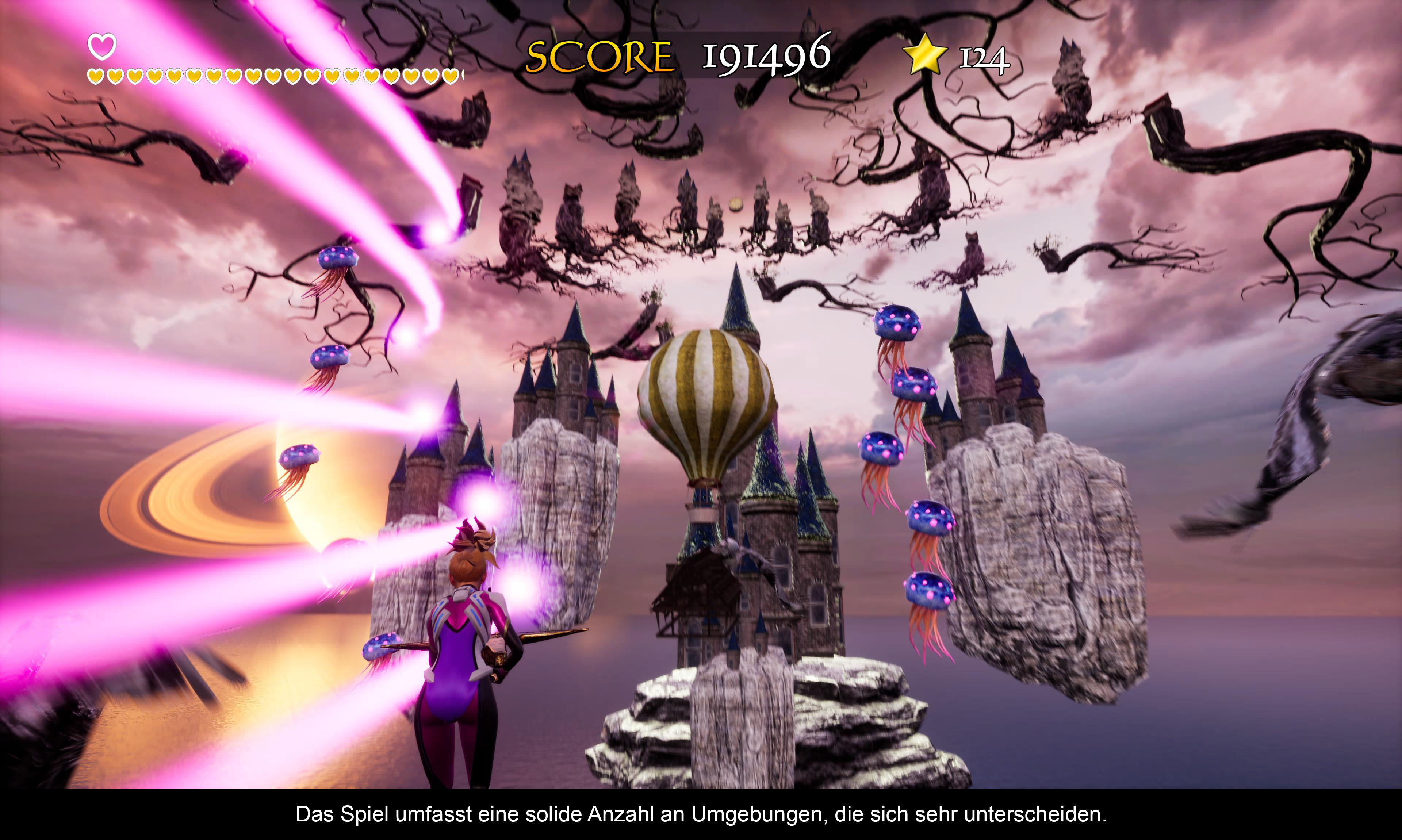 Insgesamt gibt es übrigens 12 verschiedene Levels, die sich allesamt beim Aussehen enorm unterscheiden. Darüber hinaus gibt es 10 verschiedene Boss-Gegner, die zum Schluss des jeweiligen Levels auftreten. Diese sind zumeist bildschirmfüllend und zeichnen sich durch enorme Feuerkraft aus. Alles in allem muss ich allerdings zugeben, dass die Herausforderungen relativ überschaubar sind, weil die Gegner oftmals sehr einfach sind. Die einzelnen Level sind schnell durchgespielt, und je länger man sich mit dem Spiel beschäftigt, desto schneller hat man sich an den einzelnen Welten sattgesehen. Auch wenn es die Steuerung einem nicht immer einfach macht…