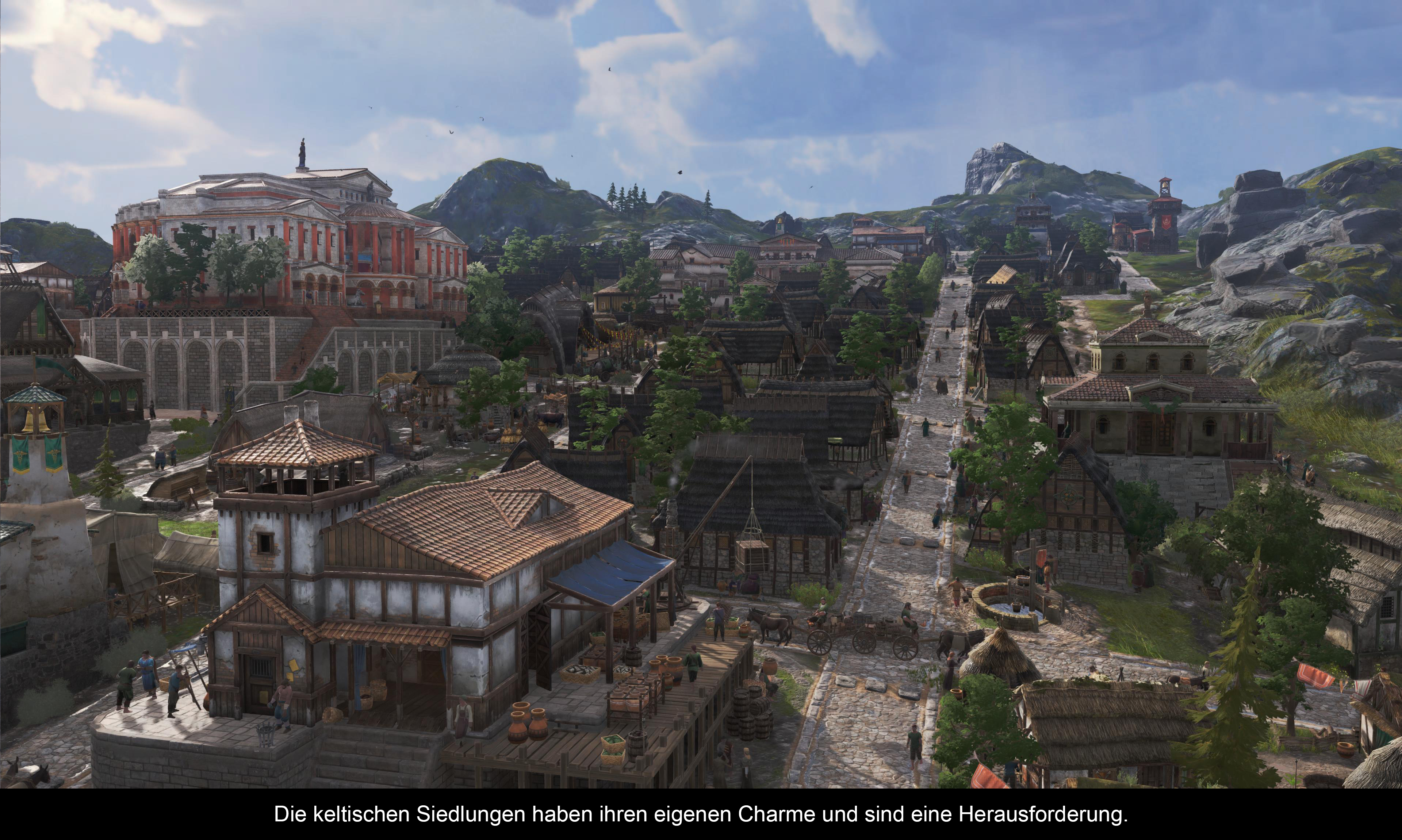 Um die Versorgung aller Güter zu gewährleisten, muss man sich den Kelten in Albion, der britannischen Kolonie, zuwenden. Statt sonniger Mittelmeerinseln findet man hier Sumpflandschaften und viel Regen. Statt schöner Tuniken bevorzugen die Kelten Schilfschuhe, und Bier wird dem Wein bevorzugt. Albion bietet eine komplett andere Bevölkerungsgruppe, bestehend aus Wanderern, Schmieden und Ältesten – oder, wer den römischen Weg wählt, Mercatoren und Edelmännern. Kelten und Römer können auf einer Insel koexistieren, haben jedoch unterschiedliche Ansprüche und Bauwerke. Ein Kernelement in Albion ist der Sumpf. Dieser liefert wichtige Rohstoffe für beide Gruppen, kann aber nur von speziellen Bauwerken genutzt werden. Da diese Inseln deutlich kleiner sind, muss man sich irgendwann entscheiden, ob man den Sumpf trockenlegt, um mehr Baufläche zu schaffen. Ähnlich wie bei den Aquädukten wird auch hier wieder die komplette Siedlungsplanung über den Haufen geworfen und der Knobelspaß kann beginnen. Beide Regionen bieten unterschiedliche Herausforderungen, können aber auf Wunsch auch für sich alleine stehen. Jedoch trägt gerade der Wechsel zwischen beiden Regionen zum essenziellen Spielspaß bei.