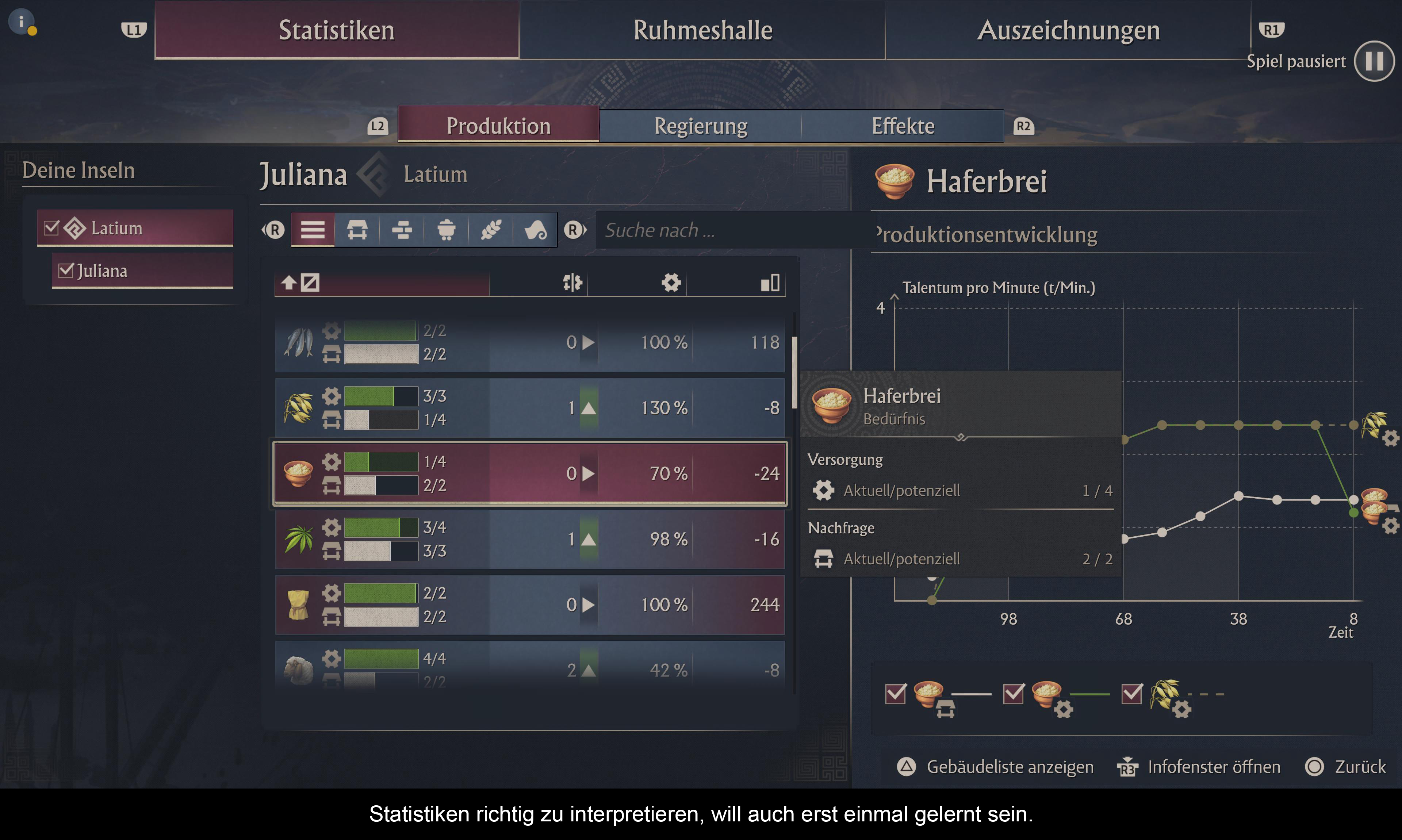 Mit der Zeit ergibt sich ein Mix aus Wohngebäuden, Industrie und Kultureinrichtungen. Das kleine Städtchen wird schnell wachsen und die Bedürfnisse der Bewohner gleich mit. Liberti (die unterste Stufe) brauchen nicht viel. Plebejer verlangen jedoch schon aufwendige Güter wie Seife oder zusätzliche Bauwerke wie einen Grammaticus. Die Ansprüche von Equites sind nochmals höher, und das geforderte Aquäduktsystem wird die Stadtplanung erneut über den Haufen werfen. Dies wird nur noch von den Patriziern übertroffen, welche sich nach dem Amphitheater sehnen. Jede dieser Bevölkerungsgruppen hat besondere Wünsche. Dank dem gut strukturierten Bedürfnissystem kann man diese schnell ablesen. Ein Mix dieser Gruppen ist unumgänglich, da sie für die Herstellung unterschiedlicher Güter benötigt werden.