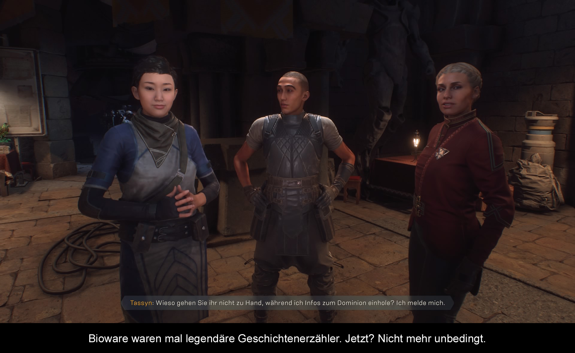 Anthem beginnt seine Kampagne mit einem schicken Intro, wo einem zunächst einmal die Welt vorgestellt wird, die man betritt. Im Mittelpunkt des Ganzen steht die Hymne (eng.: Anthem) der Kreation, welche eine starke aber auch unberechenbare Kraft darstellt, und die Menschen selbst nach Hunderten von Jahren immer noch vor vielen Fragen stellt. Ein weiteres Mysterium sind die sogenannten Relikte, die ihre Kraft aus der Hymne der Kreation entziehen, und ebenfalls über eine geheimnisvolle Macht verfügen. Im instabilen Zustand können Relikte sogar ganze Landstreifen zerstören und verheerende Auswirkungen haben. Und im Rahmen dieser unberechenbaren und mysteriösen Welt, schlüpft man als Spieler in die Rolle der sogenannten Freelancer. Während sie früher noch gefeierte Helden im Kampf gegen das Böse waren, sind sie inzwischen nicht mehr als Söldner, die von einem Job zum nächsten fliegen. Was die Story an sich angeht, sollte man kein Meisterwerk erwarten. Vor allem in den ersten Stunden wird man mit vielen Begriffen und neuen Charakteren überhäuft. Ich möchte nicht sagen, dass man hier leicht den Überblick verliert, aber es ist schwer, sich in diese Geschichte hineinzuversetzen, wenn man ohne große Einführung in dieses Epos hineingeworfen wird. Jeder will was von einem, und man weiß nicht so richtig was Sache ist, ehe man nach und nach mehr mit den Charakteren interagiert. Dies geschieht unter anderem zwischen den jeweiligen Missionen, wo ihr euch stets in einer Destiny-ähnlichen Hub-Welt wiederfindet. Von dieser Welt aus geht man auf die jeweiligen Charaktere ein, startet Missionen oder besucht die Schmiede wo ihr euren Javelin-Anzug aufwerten könnt. Dennoch wurde ich mit Fort Tarsis, so der Name des Hubs, nie so wirklich warm. Der Ort ist recht überschaubar, und man läuft stets durch die selben Gänge, und trifft größtenteils auf die gleichen Charaktere. Und obwohl ich noch nicht beim Thema Technik angelangt bin, gibt es hier dennoch einen Punkt, der ebenfalls dazu beiträgt, dass man nur ungern von Ort zu Ort wechselt. Und zwar liegt das an den Ladezeiten, die immens lang sind. Egal ob man eine Mission beginnt, oder man nach Fort Taris zurückkehrt, oder einen Besuch in der Schmiede macht – die viel zu langen Ladezeiten sorgen dafür, dass ein flüssiges Erlebnis kaum zu Stande kommt.