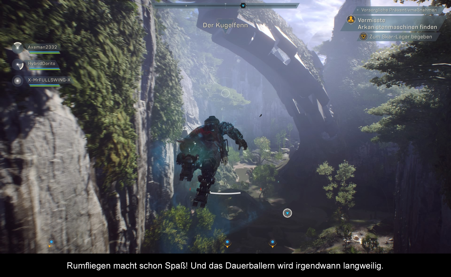Aber genug zur Story und den Charakteren - Wie sieht es eigentlich mit dem Gameplay aus? Als Schauplatz stellt euch Bioware eine riesige Spielwelt zur Verfügung, die auf dem ersten Eindruck tatsächlich an Pandora aus Avatar erinnert, wie viele andere vor mir auch schon festgestellt haben. Statt vieler einzelner Level wie in Destiny, gibt es aber nur diese eine Welt. Sie mag zwar groß sein, aber was Vegetation und Umwelt angeht, kann man kritisch anmerken, dass sich die Landschaften untereinander doch sehr ähneln. Hier und da gibt es ein paar markante Sehenswürdigkeiten, wo man denkt: „Ja, hier war ich schon mal“, aber meistens fliegt man einfach von einem Waypoint zum Nächsten, ohne der Umgebung große Beachtung zu schenken. Das Fliegen selber ist übrigens sehr gelungen. Es hat jedoch einen Twist, der manchen etwas nerven könnte. Und zwar geht es um die Energieanzeige eures Gleiters. So kann man lediglich eine begrenzte Zeit durch die Gegend fliegen, es sei denn man verhindert das Überhitzen durch Ausstecher ins Wasser oder durch das Durchfliegen von Wasserfällen. Hat man gerade kein Wasser zur Hand, bleibt einem nichts Anderes übrig als zu Landen, und kurz abzuwarten. Ich kann verstehen, dass sich manche über dieses System beschweren, aber ich persönlich hatte kein Problem damit, weil ich es immer als Herausforderung empfand, die Umgebung zu meinen Gunsten auszunutzen, um möglichst lange zu fliegen.