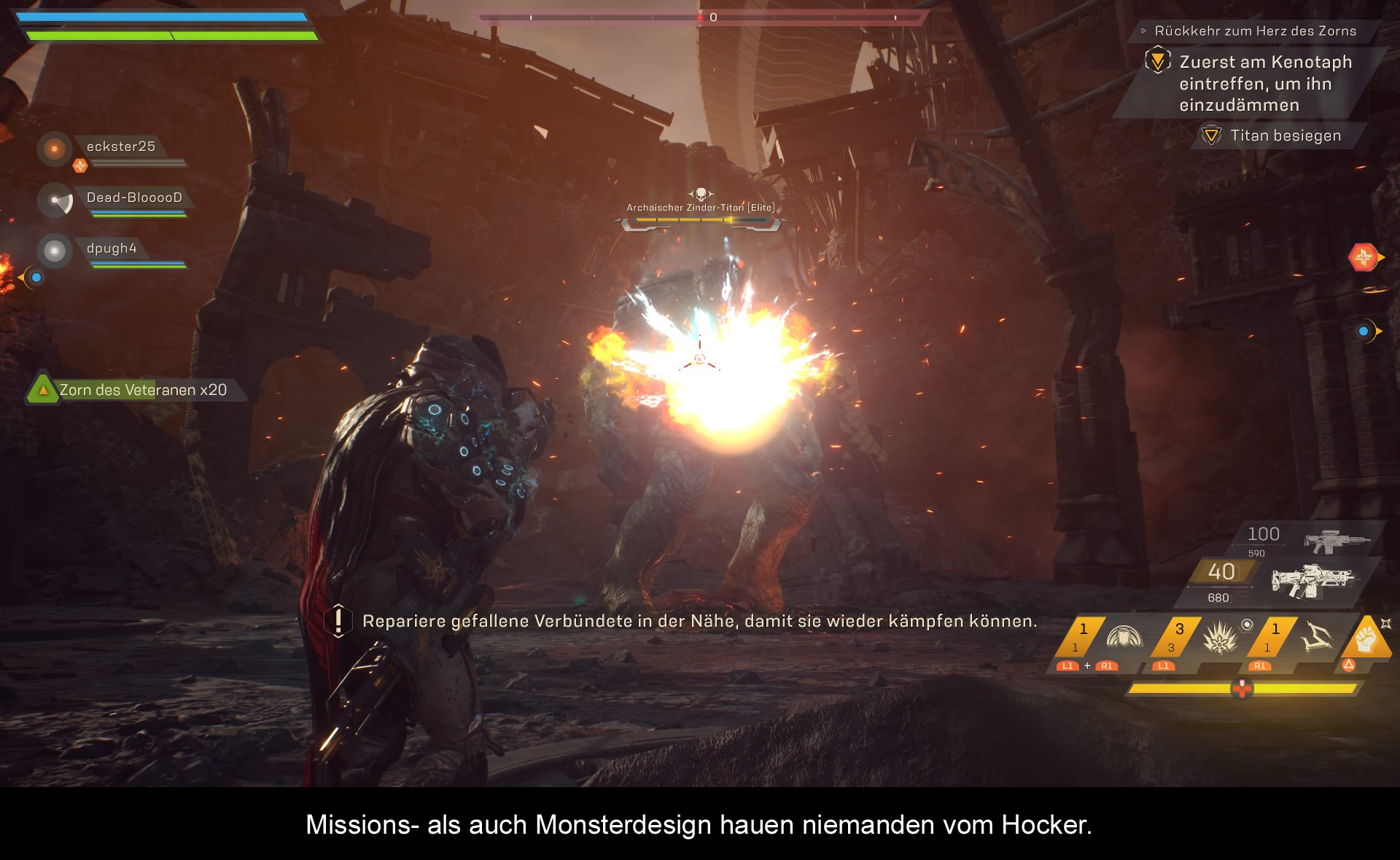 Im Mittelpunkt des Spiels steht jedoch das Ballern. Und geballert wird hier reichlich. Die Kampagne, die man entweder alleine, mit Freunden oder mit drei beliebigen Online-Spielern bestreiten kann führt euch durch zahlreiche Missionen, wo man es sowohl mit Menschen als auch Monstern zu tun bekommt. Das Problem hierbei ist jedoch die mangelnde Variation beim Missionsdesign, da man viel zu oft die gleichen Ziele vorgeschrieben bekommt. Entweder geht es darum, einfach alle Gegner zu erledigen, oder man muss eine Position halten, während Gegner auf euch zu laufen, oder man muss Objekt A zu Objekt B bringen – Alles echte Videospiel-Hausmannskost, die keinem mehr vom Hocker reißt. Hinzu kommt die Tatsache, dass sich die Waffen recht schwammig anfühlen, und kein richtiges Gewicht haben. Das Spiel selber kommt mit einer überschaubaren Anzahl an Waffensorten. Da es sich bei Anthem jedoch um einen Loot-Shooter handelt, geht es im Wesentlichen darum, so viele Gegner wie möglich umzubringen, um somit möglichst viel Loot, und hoffentlich auch neue stärkere Waffen zu erlangen. Nervig ist jedoch die Tatsache, dass man das Loot nicht sofort auswählen kann, sondern man erst warten muss, ehe man wieder in der Schmiede ist, was wie so oft bei Anthem mit langen Ladezeiten verbunden ist. Alles in allem stellt man jedoch schnell fest, dass Anthem oft nach dem gleichen Strickmuster abläuft, und das Genre definitiv nicht neu erfindet. Und ich muss zugeben, dass mich diese Inspirationslosigkeit auf Dauer etwas langweilte, und ich mir schlicht und einfach etwas mehr Abwechslung wünschte. Sei es im Gameplay oder in der Umgebung selber, die einfach oftmals zu eintönig aussieht. Bioware möchte am liebsten, dass man diesen Loop auf ewig weiter macht. Doch nach gut 30 Stunden war ich am Ende meiner Begeisterung angelangt. Wenn wenigstens die Gegnervarianten etwas unterschiedlicher sein könnten – aber auch hier fehlt es mir einfach an Vielfältigkeit. Ebenso störend ist der unberechenbare Schwierigkeitsgrad. Während man zum Beispiel eine Handvoll Missionen locker auf Schwer überwältigen kann, stellt einem das Spiel in unregelmäßigen Abständen vor gewaltigen Bossen, die selbst eure gesamte Truppe auf einmal ausradieren können. Und dann gibt es wieder unzählige Ladezeiten, ehe man wieder in den Kampf zurückkehrt. Alles in allem muss ich zugeben, dass mich Anthem anfangs zwar schon begeistert hat, diese Begeisterung aber nach und nach abnahm, was einfach an der fehlenden Kreativität lag. Sowohl beim Missionsdesign als auch bei der Story und den NPCs, deren Geschichte mich einfach nicht in den Bann zog, und ich die Dialoge im späteren Verlauf am Liebsten überspringen wollte.