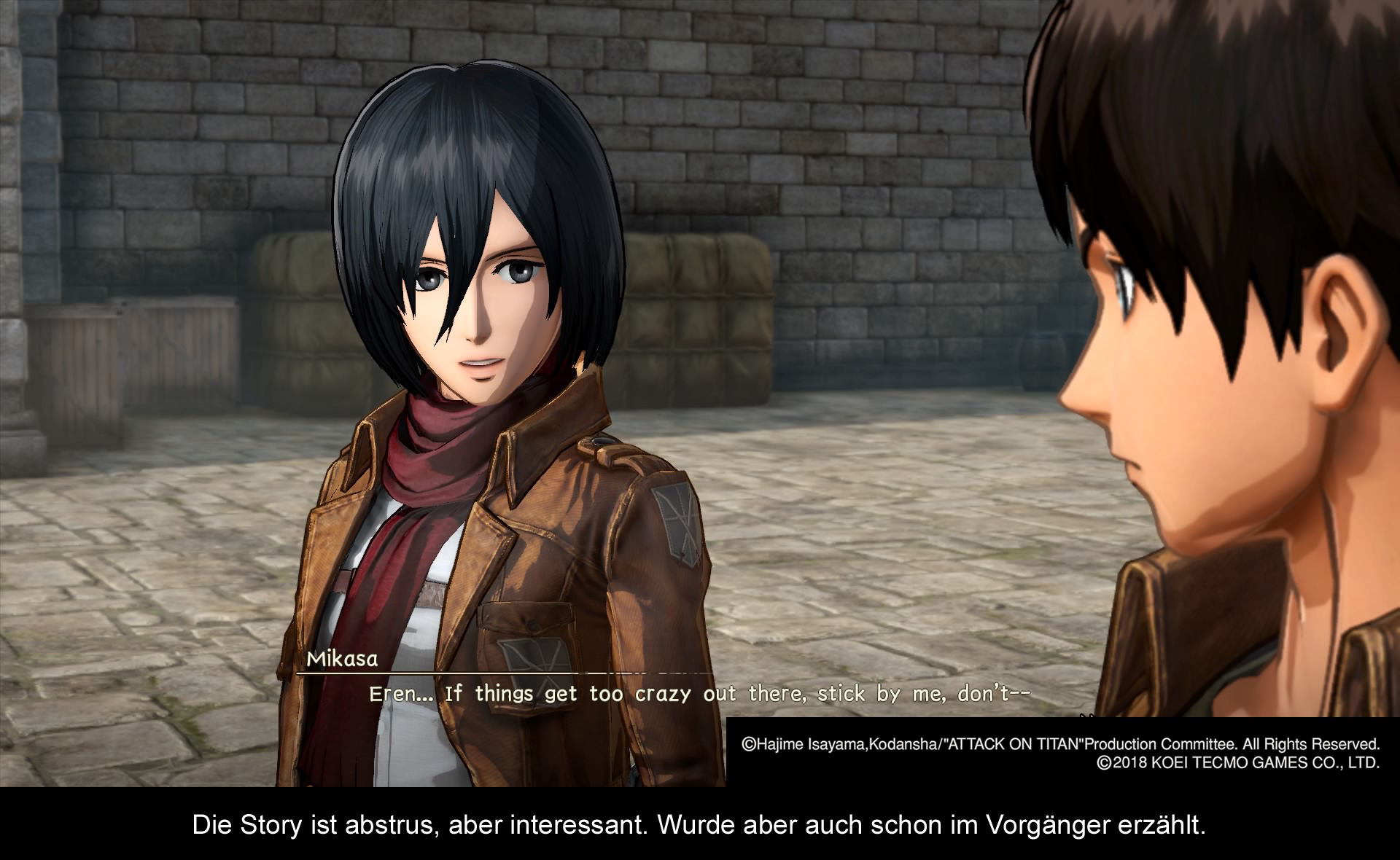 Obwohl das Spiel eine Zwei im Namen trägt, umfasst der Story-Modus erneut die komplette Story des Erstlings. Dies bedeutet, dass man zu Beginn genau da anfängt, wo es auch im Anime losgeht. Und zwar mit der Invasion der sogenannten Titanen, denen es einzig und allein darum geht, so viele Menschen wie möglich zu fressen. Überraschend ist die Attacke gerade deswegen, weil sich die letzten zurückgebliebenen Menschen nach dem Erstangriff der Titanen vor über 100 Jahren in einer Stadt verschanzt haben, die durch riesige Mauern vom Rest der Welt abgeschottet ist. Doch mit der überraschenden Invasion der Titanen, angeführt durch den kolossalen Titanen, der locker so groß wie die äußerste Mauer ist, hat die friedliche Zeit hinter der Mauer sein Ende gefunden. Angetrieben wird die Geschichte durch die Charaktere, die man auch aus der Serie kennt, einschließlich Eren Yeager, Mikasa Ackerman und Armin Arlert, die sich gemeinsam dem Militär angeschlossen haben, um die Titanen endgültig zu vernichten. Wo sich „A.O.T. 2“ jedoch vom Vorgänger unterscheidet, ist die Erzählweise. So erlebt man die Geschichte nämlich aus den Augen eines neuen Charakters, den man sich zu Beginn des Spiels selber zusammenbastelt. Dennoch ist es schade, dass ein sehr großer Teil des Spiels quasi 1 zu 1 vom Vorgänger übernommen wurde, was sowohl Missionen als auch Zwischensequenzen umfasst. Erst nach gut 15-17 Stunden erreicht man schließlich auch die Story-Inhalte der zweiten Attack on Titan Staffel. Zwar ist das Recyclen von Story-Inhalten nichts Neues in Anime-Spielen (man denke an die endlosen Nacherzählungen der Freezer- und Cell-Kapitel in den Dragon Ball Spielen), aber dennoch wirkt es hier schon etwa stillos. Zugegebenermaßen habe ich den ersten Teil nicht gespielt, wodurch das Gesamtpaket automatisch deutlich interessanter für mich ausfiel, dennoch trifft dies vor allem eingefleischte Fans der Serie, die bei einem Preis von knapp 60€ sicher etwas anderes erwartet haben.