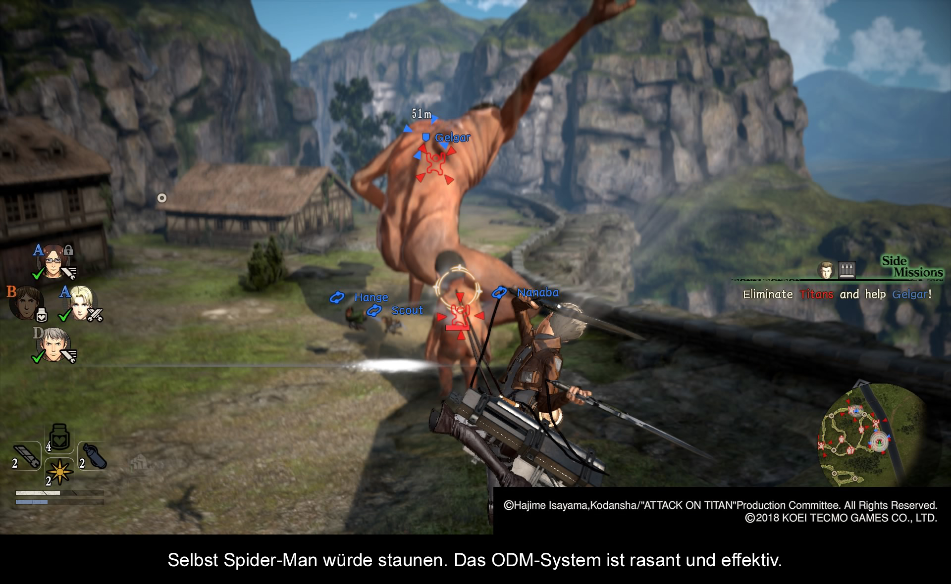 Die Story von Attack on Titan ist allgemein bekannt. Es geht darum große, nackte Monster zu töten, um das Überleben der Menschheit zu sichern. Zur Bekämpfung dieser abstrusen Figuren hat die Menschheit das sogenannte ODM (Omni-directional mobility Gear)-System entwickelt, welches dem Benutzer fantastische Mobilität garantiert, um sich durch die Stadt als auch um die Titanen herum zu bewegen. Am ehesten lässt es sich mit Spider-Mans Spinnenweben vergleichen, mit denen er sich durch New York bewegt. Zwar hat es ein wenig gedauert bis ich die Nutzung des ODM vollends begriffen hatte, doch nach einer kurzen Aufwärmphase ist es mir relativ schnell gelungen, gekonnt durch die Gegend zu fliegen, und einen Titanen nach dem Nächsten zu erledigen. Das Töten von Titanen, welches das A und O des Spiels ist, verläuft stets nach dem gleichen Muster ab. Zunächst wählt man mit dem rechten Analogstick den Schwachpunkt des Titanen aus (der direkt unter dem Hinterkopf liegt), ehe man mit dann mit der Dreieck-Taste seinen schwingenden Angriff aus der Luft durchführt. Das Spiel bietet einem aber auch die Chance an, wichtige Gegenstände zu erschließen, indem man bestimmte Körperteile erwischt, die mit einem kleinen Item-Logo gekennzeichnet sind. Diese Items kann man dann im Anschluss dafür nutzen, um seine Waffen als auch seine ODM-Geräte zu verbessern. Alles in allem war ich sehr überrascht, was den Tiefgang des Gameplay angeht. Im Laufe der ersten 10 Stunden bringt einem das Spiel zahlreiche neue Features bei, wie zum Beispiel Partnerangriffe, mit denen man seine Kollegen auffordern kann, Titanen anzugreifen und sogar ein kleines Base-Building-System, mit dem man weitere Basen aufbauen kann, die entweder dazu dienen, sein Item-Repertoire aufzufüllen, oder die Titanen anzugreifen. Darüber hinaus ist das Spiel in zwei Perioden unterteilt. Während es in der Angriffsphase darum geht, innerhalb von verschiedenen Missionen so viele Titanen wie möglich zu erledigen, gibt es auch noch ruhigere Phasen, wo es darum geht mit den anderen Charakteren zu interagieren und sie noch besser kennenzulernen. Ein bisschen wie „Persona“, aber ohne den selben Tiefgang. Mir persönlich hat dieser Wechsel zwischen ruhigen und spannenden Perioden sehr gefallen, da das ewige Metzeln irgendwann doch ein wenig eintönig wird. Wer jedoch nicht genug vom Schnetzeln bekommen kann, wird sich über einen umfangreichen Multiplayer-Modus freuen können. Hier kann man entweder gemeinsam die verschiedenen Scout-Missionen spielen, oder im Rahmen eines Wettkampfes herausfinden, welchem Team es gelingt innerhalb einer gewissen Zeit so viele Titanen wie möglich zu erledigen. Der Fortschritt, der in diesem Modus erzielt wird, reicht auch zurück in die Singleplayer-Kampagne, was sowohl Items als auch Waffen umfasst. Der Multiplayer-Modus ist ein gelungenes Feature, welches (sofern die User verbleiben) einem lange nach Abschluss der Singleplayer-Kampagne unterhalten kann.
