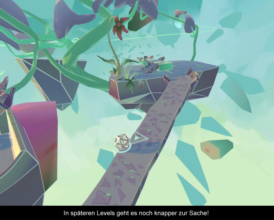 Ihr übernehmt die Rolle eines Jugendlichen Mädchens, welches in einer dystopischen Zukunft zu leben scheint und die Welt mit Müll verseucht ist. Auf einer Müllhalde kommt die kleine mit einem Artefakt in Berührung, welches einer VR Brille ähnelt. Natürlich setzt Sie die Brille auf und wird in eine Traumwelt teleportiert und verwandelt sich zudem in einen Ball. Fans von “Marble Madness” und “Super Monkey Ball” werden sich von nun an heimisch fühlen, denn unsere Aufgabe besteht darin, 25 Labyrinthe rollend zu durchqueren. Natürlich erwarten euch dabei allerlei Hindernisse, welche es zu überstehen gilt. Neben obligatorischen Abgründen, gibt es noch poröse Plattformen, sich drehende Brücken, Wippen, kleinere Schieberätsel und Sprünge zu meistern. Abseits der Hindernisse gibt es allerdings nicht viel zu tun, denn Gegner sucht man vergebens und nur ein paar Diamanten zum Einsammeln sorgen für zusätzliche Abwechslung. Hat man alle, nicht sonderlich gut verstecken, Diamanten in einem Level gefunden, wird ein Time Trail für dieses Level freigeschaltet. Hier gilt es dann die vorgegebene Zeit zu schlagen. Ein Onlinevergleich mit anderen Spielern ist allerdings nicht möglich. Die ersten 14 Level stellen den Spieler übrigens vor keine große Herausforderung, da alles noch recht übersichtlich daherkommt und die Bahnen und Plätze fast immer mit Banden versehen sind. Erst danach zieht der Schwierigkeitsgrad merklich an und man bekommt zusehends schwitzende Hände. Gerade zum richtigen Zeitpunkt, bevor das Spiel aufgrund des leichten Schwierigkeitsgrades und der einfachen Level Architektur langweilig wird. Allerdings bringt der komplexe Levelaufbau auch Probleme mit der Steuerung mit sich, womit wir den Bogen zu unserer Einleitung schlagen.
