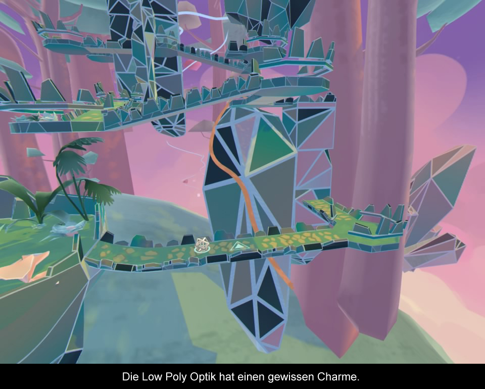 Audiovisuell gibt sich der Titel ziemlich abstrakt und besticht durch eine Low Poly Optik im Tron Stil. Musikalisch kommen sphärische elektronische Klänge zum Einsatz, die mal melodisch daherkommen, aber auch mal nur sporadisch und fiepend eingesetzt werden. Ab und an der kann dieser Mix allerdings ein wenig nervig für die Ohren werden. Ebenfalls unschön ist das “fade in” der Objekte, die sich oft nicht entscheiden können, ob sie hart ins Bild ploppen, oder gemächlich und smooth erscheinen. Während das smoothe “fade in” im Hintergrund ganz cool wirkt und zum Setting mit dem Eintauchen in die virtuelle Realität passt (hat was von gewollten Glitches), ist das ploppen von Objekten in der unmittelbaren Umgebung sehr unschön und zieht einen immer wieder aus der Welt heraus. Entweder fehlt einfach das Feintuning für die großen Headsets, oder man sparte sich die zusätzliche Arbeit der Anpassung gegenüber den Handyversionen, welche technisch ja eher limitiert daherkommen.