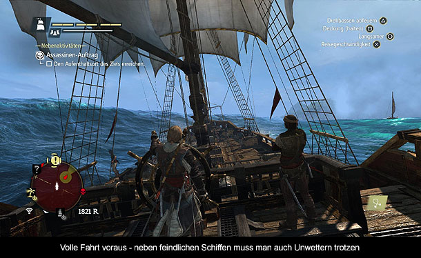 Spielerisch versucht sich Assassin`s Creed IV: Black Flag als Open World Spiel zu präsentieren. Dafür steht eine ziemlich große Welt bestehend aus mehreren Inseln zur Verfügung, die ihr alle unsicher machen könnt. Verbunden sind alle Inseln nur durch das weite Meer und so kommt ihr nicht drumherum euch ein Schiff zu suchen, um euch in der Welt fortbewegen zu können. Dabei dürft ihr als Kapitän das Ruder übernehmen und befehligt eine ganze Crew, um Segel einzuholen oder den Anker zu werfen. Das ganze ist wirklich simpel gelöst und der Kampf mit den Wellen oder immer wieder auftretenden Stürmen macht viel Spaß, da man die Trägheit des Schiffs beachten muss und den Wellengang im wahrsten Sinne des Wortes spürt. Hin und wieder trifft man dabei auf einige Schiffe, die einem nicht immer freundlich gesellt sind und so kann man dann zu den Kanonen greifen. Diese befinden sich an den Seiten und an der Front des Schiffes und können per einfachem Tastendruck ausgelöst werden. Hat man dann das Schiff des Gegners entsprechend beschädigt, kann man es entern, indem man auf das andere Schiff springt und die Gegner bekämpft. Hat man diesen Kampf gewonnen, darf man sich am Lager des Schiffes bedienen und anschließend das eigene Schiff reparieren oder z.B. Überläufer in die eigene Crew aufnehmen. Man muss jedoch aufpassen mit wem man sich anlegt, da die gegnerischen Schiffe in unterschiedlichen Größen auftreten und vor allem mit Kriegsschiffen ist nicht zu spaßen. Diese sind nicht nur bis an die Zähne bewaffnet, sondern besitzen auch über eine riesige Crew, welche bekämpft werden muss. Zum Glück kann man sein eigenes Schiff auch aufwerten und beispielsweise Mörser installieren oder die Verteidigungsanlagen verbessern. Leider kann man gegnerische Schiffe nicht übernehmen oder eine eigene kleine Flotte gründen. Trotzdem macht das Fahren mit einem Schiff unglaublich Spaß und wenn man erstmal Gefallen am Entern gefunden hat, wird man jedes vorbeiziehende Schiff plündern möchten.