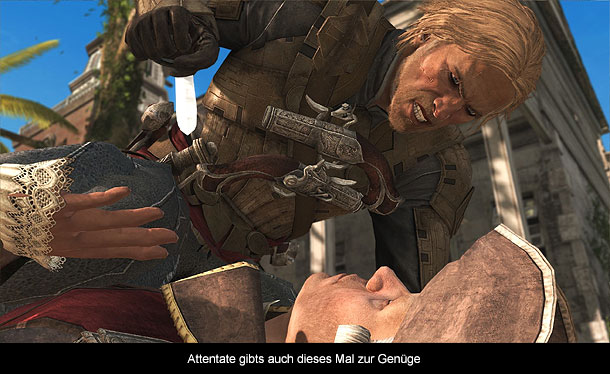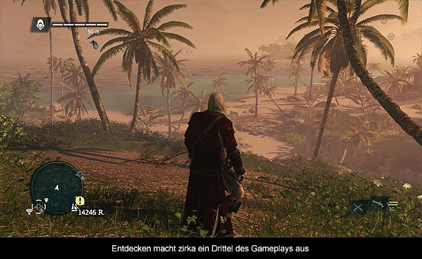 Wenn man sich nicht gerade auf dem Schiff befindet, ist man in Assassin`s Creed IV: Black Flag höchstwahrscheinlich an Land und darf die Städte und Dörfer zu Fuß unsicher machen. Hier gibt es dann unheimlich viele Dinge zu entdecken und zu erledigen. Einerseits gibt es natürlich die Storymissionen, welche die Geschichte vorantreiben. Leider fallen diese nicht besonders toll aus und laufen fast alle nach dem selben Schema ab. Erst wird die Zielperson verfolgt und belauscht, um sie dann am Ende zu eliminieren und das wiederholt sich dann einige male. Eher selten wird man auch mal auf Erkdungstour geschickt oder muss Sachen stehlen. Deutlich besser sieht es da bei den anderen Aktivitäten aus. Hier kann man unter anderem weitere Assassinen-Missionen annehmen, Piraten anheuern, seine Waffen und das Schiff verbessern, Schätze suchen, Collectibles sammeln, Inseln entdecken, Tauchen gehen, Tiere jagen oder eben auf den Weltmeeren alles entern, was bei drei nicht hinter dem Horizont verschwunden ist. Wer also nicht unbedingt Lust auf eine Storymission hat, wird sicher einen anderen Zeitvertreib in der Karibik finden und manche verlieren sich auch völlig darin. Leider haben all diese Spielbestandteile mit einigen Problemen im elementaren Gameplay zu kämpfen. So hat sich der bekannte Free Running Modus seit dem ersten Spiel kaum verändert und hat demnach auch heute noch mit einer etwas hakeligen Steuerung zu kämpfen, die oftmals anders reagiert, als man sich das vorstellt. In Verfolgungsjagden kann das schon mal zum Abbruch der Mission führen, weil man z.B. plötzlich ganz anders abbiegt. Ebenfalls verbesserungswürdig ist das Kampfsystem. Dieses basiert auf der Möglichkeit gegnerische Angriffe kontern zu können. Dazu muss eine Taste gedrückt werden und anschließend kann der Gegner mit einer einzigen weiteren Taste erledigt werden. Dadurch dass das Kontern kaum Geschick erfordert, werden Kämpfe eher zur belanglosen Last, als zu einem fordernden Spielerlebnis. Ebenfalls etwas nervig ist die Kollisionsabfrage, welche schon mal dafür sorgt, dass kein Angriff möglich ist, weil die Gegner nicht richtig erkennt werden oder etwas anderes den Angriff oder einen Konter verhindert. Wirklich schlimm ist jedoch die Gegner-KI ausgefallen, welche sich mit einfachsten Tricks aushebeln lässt. Denn selbst wenn man mal gesehen wird, kann man sich durch einfaches Verstecken in einem Busch vor der Nase des Gegners wieder unsichtbar machen. Dadurch werden die vermeintlich schweren Schleichmissionen ziemlich einfach, da die KI total unnatürlich agiert. Natürlich funktionieren diese Gameplayelemente zwar grundlegend, aber eben nicht besonders gut. Viel zu oft muss man sich über Kleinigkeiten ärgern, wodurch Missionen neugestartetn werden müssen. Vor allem zeigen andere Spiele, dass die Mechaniken auch besser gelöst werden könnten. Trotzdem entschädigt die schier unendliche Menge an Aktivitäten für die kleineren Fehler im Gameplay, da es einfach immer was zu entdecken gibt und man so im Grunde ständig mit "Erfolgsmomenten" belohnt werden kann, wenn man sich darauf einlässt. Daher stattet man der Welt gerne einen weiteren Besuch ab.