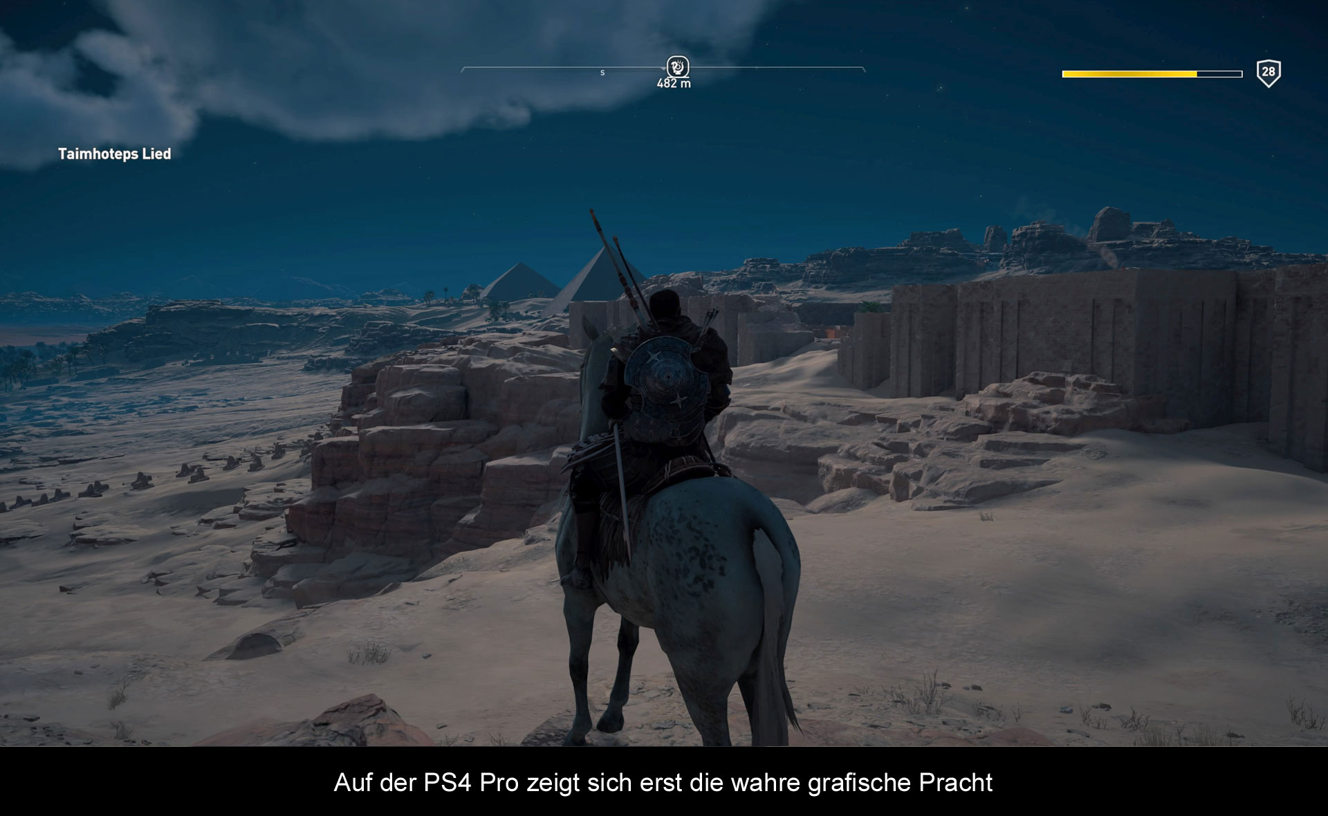 Das neueste Assassin's Creed bricht mit einigen Traditionen – zum Beispiel ist „Origins“ mehr Action-Rollenspiel als reines Schleichspiel. Das liegt wohl daran, dass sich die Entwickler vor allem am erfolgreichen „The Witcher 3“ orientiert haben. Dazu erinnert einfach zu vieles daran – am ehesten ist mir noch das Reiten bzw. das automatische Wegesystem im Gedächtnis geblieben. Mit einem Knopfdruck bleibt man beim Reiten auf den Wegstrecken haften (wie auf einer Carrera-Rennbahn) und kann sich automatisch zum Ziel leiten lassen. In einigen Punkten übertrifft „Origins“ CD Project REDs Vorzeigetitel sogar – das Kampfsystem ist griffiger und geht gut von der Hand, Reiten macht mehr Laune, da man nicht an jedem Strauch hängen bleibt und das Inventar ist mit den Unmengen an Loot auch einfacher zu bedienen. Dafür schwächelt es an anderer Stelle: Zum Beispiel der Story. Bayek ist zwar ein cooler Typ und man kann als Spieler auch seine Motivation verstehen, aber Aya, seine Frau, ist eigentlich eine ziemlich kaltherziges Weib – niemand den man freiwillig heiraten würde. Und schon der Start gestaltet sich dementsprechend holprig, dann kommt ein recht normaler (aber wenig spannender) Zwischenteil und dann geht es rucki-zucki ins abrupte Finale. Was bleibt ist ein eher mäßiges Gefühl des Triumphes, dafür aber noch eine Menge zu tun, denn das alte Ägypten ist riesig und mit zahlreichen Aufgaben versehen. Leider sind die nur in den wenigsten Fällen spannend oder interessant. Viel Lückenfüllerei könnte man meinen – und Aussichtstürme gibt es auch wieder in ausreichender Anzahl zu erklettern. Warum also eine so hohe Wertung? Tja, das liegt an der wirklich gelungenen und detaillierten Darstellung der Zeitepoche und an der Steuerung. Es spielt sich einfach! Auch wenn man nicht mehr heimlich vorgehen muss – jetzt kann man sich auch kämpfend in die Schlacht werfen, oder mit dem Bogen ungestört aus der Ferne agieren. Zudem ist der Onlinemodus geschickt integriert worden. Zwar gibt es kein kooperatives Zusammenspiel, dafür aber zeitlich befristete Herausforderungen der Götter, oder man rächt andere – gestorbene Spieler, sieht sich deren Fotos an und noch vieles mehr. Keine dummen Free to Play Zeitverschwendungen wie in den letzten beiden Teilen (ua. Flottenkrieg). Zwar gibt es auch hier Micro Transaktionen, aber die braucht man nicht – zumindest bislang. Den Rest kann man sich teuer mit echtem Geld erkaufen, aber auch hier, wie bereits in der Vergangenheit bei allen Ubisoft Spielen gilt: Kein Season Pass ist sein Geld wert. Und das Kollege Dimi von der Grafik nicht beeindruckt ist, mag vielleicht daran liegen, das er nur auf einer Standard PS4 spielt. Wer eine PS4 Pro besitzt, bekommt auch was für sein Geld geboten, denn „Origins“ sieht um ein Vielfaches besser auf der Edel-Konsole aus. Höher aufgelöst, klarere Texturen und eine geschmeidige Framerate. Mich hat der Titel schon des Öfteren zum Staunen gebracht. Und auch beim Sound kann man vieles Loben – die dt. Sprachausgabe ist top und die Ambient-Kulisse passt perfekt – lediglich ab und an, wäre ein stärkerer Soundtrack wünschenswert gewesen. Aber gut, man kann eben nicht alles haben. Übrigens, Seeschlachten sind auch hier dabei, kommen aber leider viel zu selten vor. In dem Sinne, das beste Assassin's Creed seit Jahren!