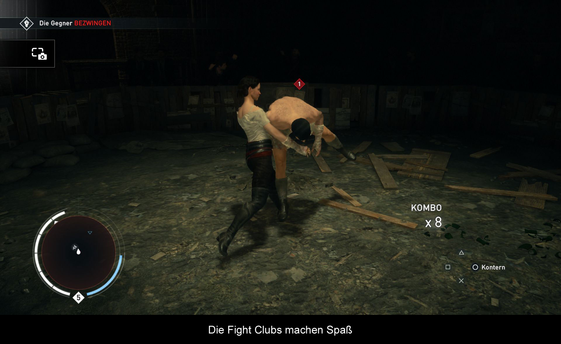 Angesiedelt ist der neueste Teil im London zur industriellen Revolution. Das bedeutet, Slums, Fabriken, reger Betrieb an der Themse, aber auch bereits noblere Regierungsviertel und Wohngegenden rund um Westminster. Der Look wurde jedenfalls sehr gut eingefangen und dank Wettereffekten und einem dynamischen Tag/Nacht-Wechsel (gab es im Vorgänger nicht) kommt viel Stimmung auf. Auch bei den Inneneinrichtungen (davon gibt’s schon eine ganze Menge) haben sich die Designer viel Mühe gegeben. So sehen Pubs in den Armenvierteln deutlich anders aus, als in den reicheren Bezirken. Die Ladezeiten halten sich in Grenzen und fallen nur dann wirklich negativ auf, wenn man eine Mission erneut laden muss. Ansonsten wirkt das visuelle Erlebnis wie aus einem Guss und weiß mit detaillierten Charaktermodellen und einzigartigen Finishern bei Zweikämpfen zu begeistern. Das die Framerate dann auch mal einen Sprung nach unten macht, stört zwar, ist jedoch jetzt nicht so auffällig, dass es das Spielerlebnis direkt beeinflussen würde. Der Ambientsound unterstreicht zudem passend die Atmosphäre, genauso wie die gefällige Musik, die öfters mal einsetzt. Großes Lob verdient auch die Abmischung (toller Surround-Sound) und die deutsche Synchronisation, die mit tollen Sprechern aufwartet und nur ein paar Patzer hinlegt (zu junge Stimme bei Darwin).