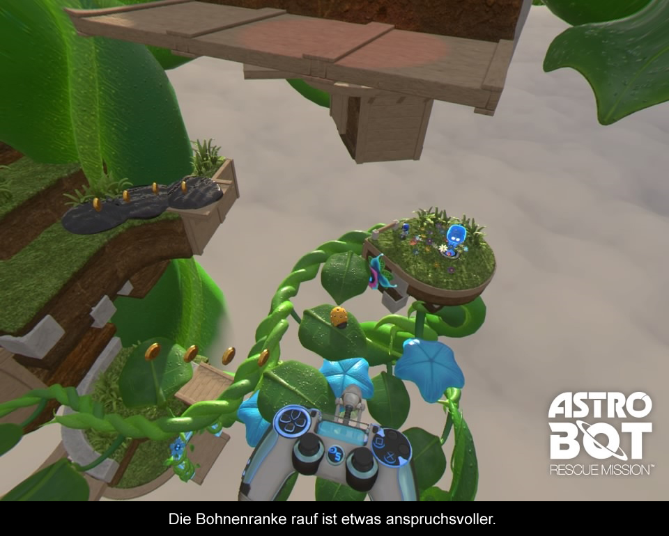 Und da kommen wir auch schon zum wichtigsten Teil. Die virtuelle Realität hievt das Jump and Run Genre wirklich auf eine neue Ebene und wurde erstklassig und sehr ideenreich integriert. Selbst, wenn man nicht durch die rosarote VR Brille schaut muss man einfach sagen, wo damals "Super Mario 64" dem Spieler neue Perspektiven bot, bietet “Astro Bot: Rescue Mission” nun das gleiche für die virtuelle Realität! Man sitzt nicht nur stur auf seinem Hintern und lenkt den kleinen Roboter durch einfache 3D Welten, sondern muss aktiv am Geschehen teilnehmen. Dies gilt nicht nur, um die vielen verstreuten Roboter zu finden, auch spielerisch ist man voll involviert. Man selbst ist ebenfalls ein großer Roboter und schwebt auf vorgegebenen Bahnen durch die Levels, während man den Astro Bot links, rechts, oben und unten von einem selbst sicher mit dem DualShock durch die Level führen muss. Man dreht also ständig seinen Kopf (keine Angst, man verfällt nicht in Hektik) und muss nach oben und unten schauen, was aufgrund der einfallsreichen Levelarchitektur sehr viel Spaß macht und einen immer wieder überrascht, was alles mit VR möglich ist. Der eigene Charakter muss zudem immer mal wieder ins Geschehen eingreifen und mit dem Kopf Wände durchschlagen, feindlichen Geschossen ausweichen (die einem sonst mit Glibber die Sicht versperren) und Gegner zum Beispiel mit zurück geworfenen Bällen eliminieren. Aber auch unser Controller erhält immer mal wieder temporäre Upgrades für einen Level/Abschnitt, wo man mittels Wasserkanone ebenfalls Gegner bei Laune hält oder pflanzliche Plattformen zum Blühen bringt. Oder man erhält einen Greifhaken, mit dem man Wände zum Einstürzen bringt oder über Abgründe Seile spannt, damit unser Astro Bot sicher eine Schlucht überqueren kann. Cool sind dann auch noch die Ninja Sterne, mit denen mal Plattformen baut oder die Taschenlampe, mit der man dunkle Bereiche ausleuchten muss. Natürlich gibt es auch einige nette Gimmicks am Wegesrand, wie zum Beispiel kann man Pusteblumen wegpusten, mittels Bewegung Blumen zum Tanzen bringen, man sieht Tiere und die Vegetation mit Gesichtern im Look der Astro Bots und so weiter. Was hier an Ideen in die virtuelle Welt transferiert wurde, ist schon echt cool! Selbst die Verstecke der kleinen Astro Bots sind herrlich niedlich und herzzerreißend, wenn ein kleiner Freund zittern mit einem Blatt über den Kopf oder mittels Pappkarton sich zu verstecken versucht, die Bots die Vegetation oder Gegenstände imitieren, an einem Deckenventilator herumschleudern oder einfach nur relaxed mit einem Drink in der Sonne faulenzen.