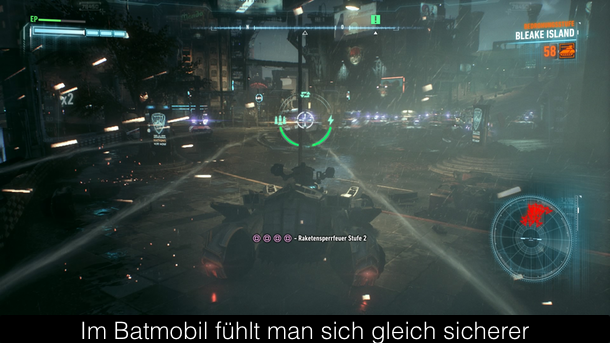 Da in Batman: Arkham Knight das Spielgeschehen in ganz Gotham City stattfindet, reicht es nun nicht mehr sich zu Fuß oder durch die Luft gleitend fortzubewegen, weswegen Rocksteady das Batmobil endlich ins Spielgeschehen integriert hat. Auf Knopfdruck könnt ihr es herbeirufen und so durch die Straßen von Gotham City heizen. Dabei stehen euch zwei Modi zur Verfügung. Einmal ein normaler Fahrmodus, in dem ihr ziemlich schnell unterwegs seid und in Verfolgungsjagden die Gegner entweder von der Straße drängt oder sie mit ein paar gut gezielten Lenkraketen ausschaltet. Manchmal hat man es aber nicht nur mit ein paar gewöhnlichen Straßenganoven zu tun, sondern mit den Schergen von Scarecrow, die gerne auf unterschiedliche Panzer zurückgreifen. Hier könnt ihr in den Kampfmodus schalten, der euch bessere Steuerungsmöglichkeiten auf engem Raum bietet und indem ihr volle Kontrolle über euer Waffenarsenal habt. Auf dem Papier ist das Batmobil also eine willkommene Ergänzung, doch leider gibt es ein paar gravierende Probleme. So ist die Steuerung des Batmobils im normalen Modus unheimlich schwammig und nur mit viel Geduld gewöhnt man sich daran. Die Kampfszenen mit anderen Panzern sind auch nicht sonderlich spannend und laufen immer nach Schema F ab. Leider fand Rocksteady das Batmobil so toll, dass man sich dazu entschied dieses in so vielen Szenen wie nur möglich einzusetzen. Zum Teil auch in wirklich absurden Gameplayabschnitten, wo man ganze Plattformrätsel mit dem Batmobil lösen muss und zufälligerweise hat der Riddler seine Rätsel alle aufs Batmobil ausgelegt. Hier wäre weniger deutlich mehr gewesen, wenn dafür die Qualität angehoben worden wäre. Immerhin gibt es ansonsten das bekannte Gameplay aus den Batman Spielen mit dem ausgefeilten Combosystem. Eine Neuerung in diesem sind Doppelmoves, die ihr ausführen könnt, wenn euch jemand im Kampf zur Seite steht. Sei es Catwoman, Robin oder jemand anderes. Die geben dem Spiel noch mal etwas Abwechslung, aber kommen im Spiel leider viel, viel zu kurz. Des Weiteren gibt es die vielen Gadgets, fast schon zu vielen. Denn vor allem zu Beginn ist man völlig überfordert, weil man die meisten Gadgets aus dem Vorgänger schon besitzt und so wirft das Spiel einen ins kalte Wasser. Kaum etwas wird erklärt und so muss man teilweise erstmal überlegen, welche Taste man drücken soll. Denn die meisten Tasten sind doppelt und dreifach belegt und je nach Gadget auch gerne mal mit völlig anderem Resultat. Ansonsten gibt es für Fans des dunklen Ritters viel zu tun mit zahlreichen, zum Teil durchaus interessanten, Nebenquests und einigen Collectibles und den schier nie enden wollenden Riddler-Aufgaben.