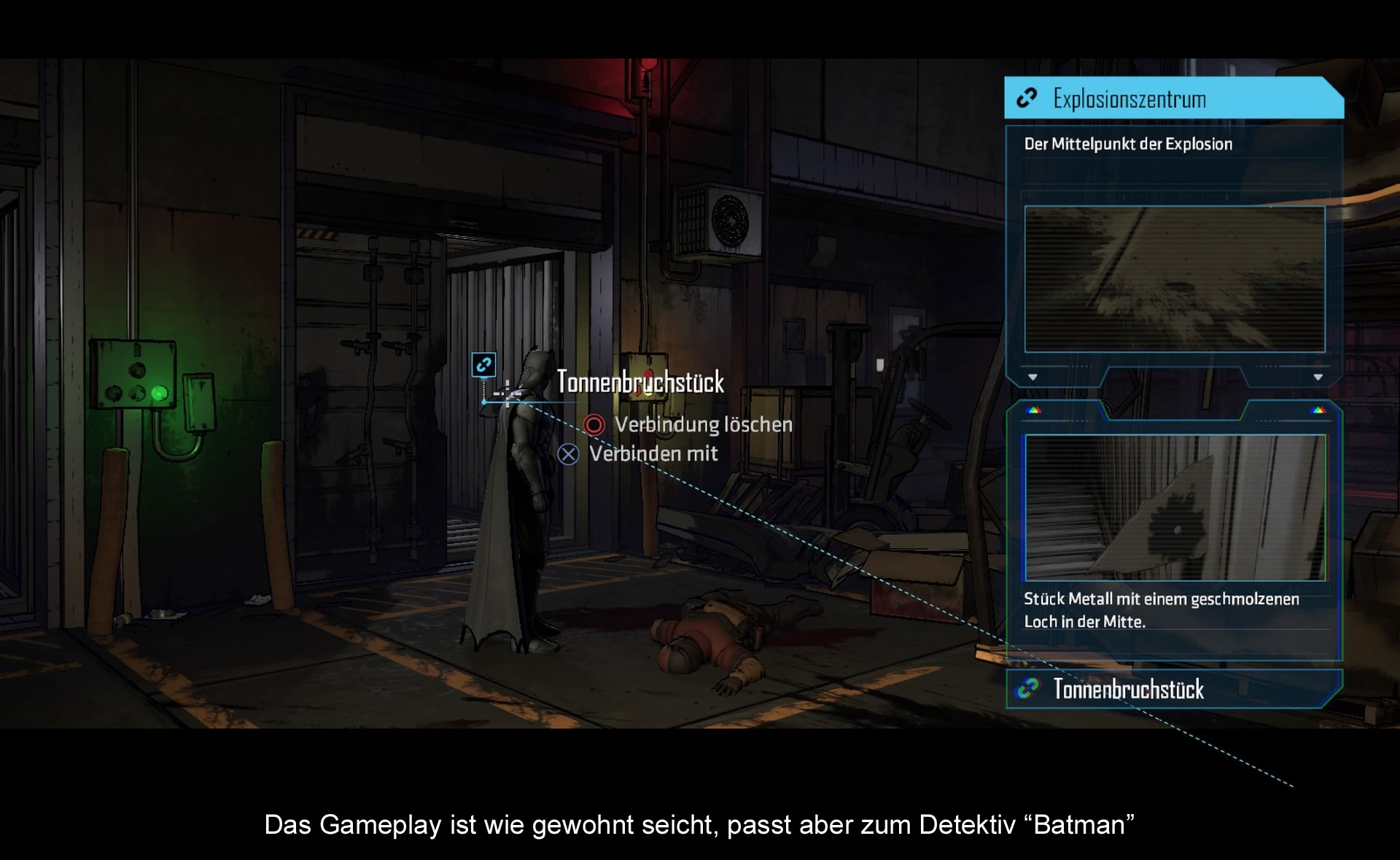 Qucik Time Events und Dialoge sind die Gadgets mit denen Telltale Games arbeitet und sie sind hier zahlreich vertreten. Über die gut zwei Stunden gibt es verschiedene Entscheidungen zu treffen, die sich auf in der Handlung auswirken. Naturgemäß sind diese in Episode 1 relativ unbedeutend, doch legt man hier einige wichtige Grundsteine. Will man einen eiskalten Frank Miller Batman, der nicht vor Gewalt zurück schreckt oder einen Scott Snyder Batman, der mit Furcht und Taktik vorgeht. QTE wurden wieder so gewählt, dass sie gut von der Hand gehen und das gezeigte am Bildschirm widerspiegeln. Es gibt zwar ein paar Aussetzer, doch sind diese nicht gravierend. Neu ist das Batman Symbol in der Ecke. Hat man einen Großteil der QTE Richtig ausgeführt bekommt man einen schönen Batman Slowmotion-Takedown zu sehen. Völlig neu sind kleine Rätsel, die diese Bezeichnung im Vergleich zu anderen Telltale Spielen verdienen. Als guter Detektiv gilt es Verbrechensschauplätze zu analysieren. Hat man alle Beweise muss man diese Sinnvoll miteinander verketten. Am Ende entsteht ein Bild, was an diesem Schauplatz vorgefallen ist. Weitere Neuheiten betreffen den individuellen Verlauf der Geschichte. Als kleinen Aperitif kann man am Anfang der Geschichte die Farbe seiner Bat-Gadget wählen. Weiter geht es dann bei den Action Sequenzen. Hier lässt einem das Spiel die Wahl zwischen zwei oder drei Takedowns. Spielerisch eher Nebensache, erhöht aber den Wiederspielwert!