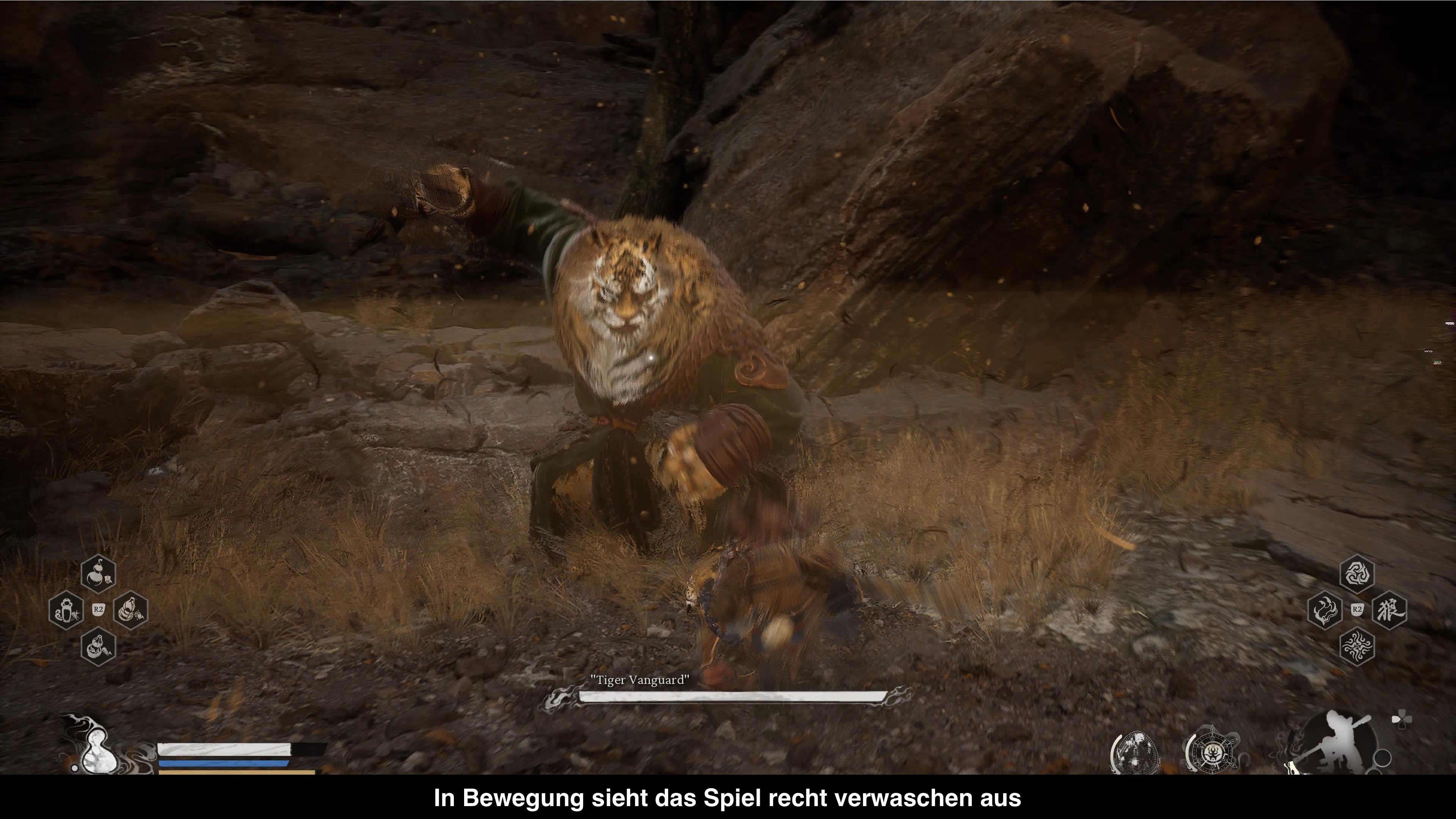 Als eines der ersten Spiele unterstützt Black Myth: Wukong die Unreal Engine 5 und zahlreiche Features werden genutzt, wodurch das Spiel in der Theorie wirklich toll aussehen kann. Die Praxis auf der PlayStation 5 ist leider etwas kompliziert. So wurden ein paar der Effekte, wie z.B. Raytracing, in der PS5 Version zurückgeschraubt oder gar gestrichen worden. Aber offenbar war dies nicht genug, denn trotz drei Grafikmodi läuft das Spiel in keinem der Modi zufriedenstellend. Im Qualitätsmodus läuft das Spiel sehr unrund mit über 30 Bildern pro Sekunde, weil kein Framecap implementiert wurde, was quasi konstant zu Ruckeln führt. Im Balance Modus entschied man sich aus irgendeinem Grund für ein Framecap von 45 Bildern pro Sekunde, was rein mathematisch schon nicht funktionieren kann. Im Performance Modus erreicht man zwar öfter mal die 60 Bilder pro Sekunde, aber einerseits gibt es weiterhin regelmäßig starke Ruckler und andererseits werden die höheren Bildraten nur dank FSR3 (Framegeneration) erreicht. Das sorgt für einen erhöhten Input Lag, was den Vorteil der Bildrate vernichtet. Zudem nutzt das Spiel scheinbar FSR2 für das Upscaling, was oftmals zu starkem Ghosting auf dem Bild führt. Insgesamt gesehen ist die grafische Präsentation recht enttäuschend, weil das Bild einfach sehr unruhig ist und zudem die Performance nicht gut genug ist. Letztlich ist kein Grafikmodus zu empfehlen. Dafür kann man immerhin das Artdesign loben. Immer wieder gibt es imposante Bauten und schöne Panoramen zu sehen und auch die vielen Bosse sind alle abwechslungsreich gestaltet. Hier hat man definitiv viel Liebe ins Detail gesteckt.