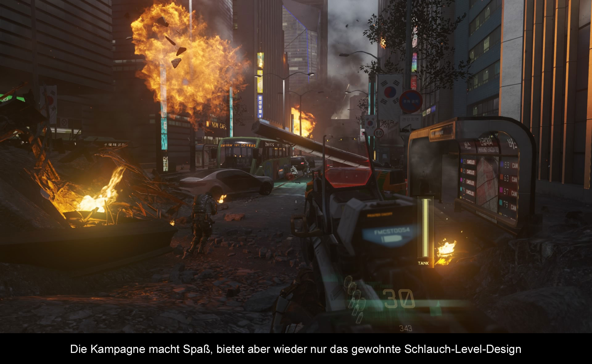 In der Kampagne von Sledgehammer-Games schlüpft ihr in die Rolle des US-Soldaten Mitchell. Ihr beginnt auch direkt mitten im Einsatz, denn die koreanische Terrorgruppe KVA versucht ihren Einflussbereich zu vergrößern und das können die Amerikaner natürlich nicht zulassen. Der Einsatz geht jedoch ordentlich schief und dabei stirbt nicht nur euer bester Freund, sondern ihr verliert auch euren linken Arm. Die Armee hat natürlich somit keinen Nutzen mehr von euch, aber glücklicherweise gibt es noch Atlas. Ein privates Unternehmen, welches die Armee in den Kriegen dieser Welt unterstützt und die haben für euch noch eine Aufgabe. Denn Atlas hat sich dem Krieg gegenüber der KVA verschrieben. Aber wenn ein privates Kriegsunternehmen so viel Macht erhält, kann es nur zu Problemen kommen und dies wird von dem Spiel auch thematisiert. Das mit dem Arm ist übrigens auch kein Problem mehr, denn in der Welt von „Call of Duty: Advanced Warfare“ verfügen die Soldaten über Exoskelette, welche die Soldaten im Kampf unterstützen. So können Soldaten höher springen, problemlos Autos zur Seite schieben oder die Zeit verlangsamen. Die Exoskelette übernehmen dabei eine zentrale Rolle in den Missionen, da in jeder Mission die Fähigkeiten wechseln. Leider wird der Einsatz sehr stark vorgegeben und bis auf das hohe Springen oder das verlangsamen der Zeit kann man nichts sinnvoll im Kampf einsetzen, sondern nur, wenn das Spiel das auch von einem möchte. Also wenn man mal eine Wand hochklettern soll oder ein Auto wegschieben darf. Etwas mehr Freiheit wäre schon schön gewesen. Denn wie cool wäre es gewesen, wenn man die Gegner mit der Exokraft einfach zerquetschen könnte im Nahkampf? Solche Szenen gibt es leider nie und hier hat man etwas Potenzial verschenkt. Trotzdem weiß die Geschichte zu überzeugen. Sie wird zwar sicher keinen Oscar für die beste Geschichte gewinnen, aber sie erfüllt ihren Zweck. Leider ist die Geschichte auch stark gescriptet, wodurch sich ein zweiter Spieldurchlauf kaum lohnt. Übrigens übernimmt mit Kevin Spacey (House of Cards) ein echter Star die Rolle des Atlas-Chefs. Die Rolle wird dadurch zwar nicht besser, aber es ist ein nettes Detail.