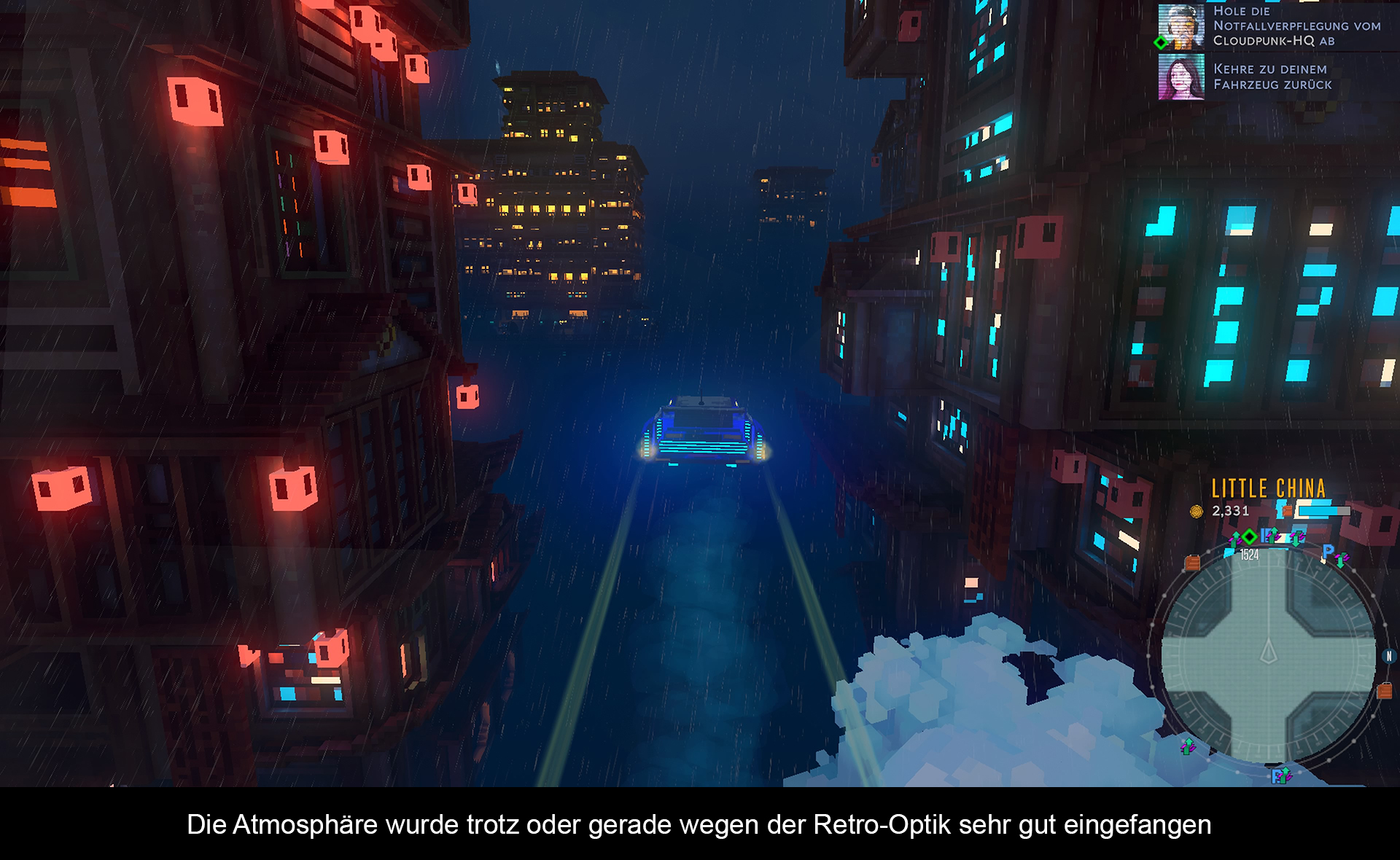 Grafisch setzt „Cloudpunk“ auf Voxel-Grafik im Stil alter PS1 Spiele. Natürlich mit reichlich Neon-Farben versehen und einem permanenten Dauerregen. Der Retro-Stil hat schon was und sprüht nur so vor Atmosphäre. Allerdings ist das kein Freifahrtschein für die technischen Unzulänglichkeiten. So ist die Framerate bestenfalls akzeptabel und wird obendrein durch permanentes Tearing gestützt. Die Sichtweite ist auch nicht sonderlich hoch und es ploppen zahlreiche Objekte ins Sichtfenster. Die allgemeine Bildqualität wirkt ebenfalls unsauber. Die einzelnen Stadtteile sind durch Ladebildschirme verbunden, was ziemlich störend wirkt, da man praktisch immer in andere Stadtteile fliegen muss. Apropos Fliegen, andere Fahrzeuge sieht man fast nur beim Betreten eines Bezirks, umso länger man fliegt, umso weniger Verkehr befindet sich in der Luft. Hier kommt die Engine ganz klar nicht mit dem Streamen hinterher. Zu Fuß spielt man am Besten in der Ego-Perspektive, das ist flüssiger und man muss keine schlechten Laufanimationen ertragen. Übrigens die namensgebenden Wolken sind praktisch immer nur oben bzw. unten zu sehen, durchfliegen kann man diese jedoch nie.