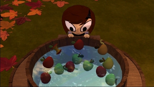 Nachdem ich mich entschieden habe, welches der beiden Kinder ich spiele, erwartet mich eine leicht zu verstehende Lightversion eines RPGs. Es folgt der altbekannten Formel mit Erfahrungspunkten, Charakterwerten, speziellen Fähigkeiten und zu erfüllenden Quests, aber es artet nie in kleinkarierte Planung aus. Ich laufe zuerst alleine, nachher bis zu dritt, im Level herum, sammle Süßigkeiten und klopfe an Haustüren. Und wenn diese sich öffnen, kommt entweder ein Erwachsener mit noch mehr Bonbons zum Vorschein oder ein Monster, gegen das ich kämpfen muss. Jetzt verwandelt sich das Roboterkostüm aus Pappe in einen stählernen Koloss, der locker mit Gundam und Co mithalten könnte. Genauso verwandeln sich die anderen harmlosen Kostüme in große, gefährliche Versionen. Die Auswahl reicht von Space Ranger, Ninja und Freiheitsstatue bis zum Einhorn und sogar eine Schachtel Fritten ist mit dabei. Das Kampfsystem ist rundenbasiert und erinnert an alte Final-Fantasy-Teile. Jede Attacke kann durch ein einfaches Quick Time Event verstärkt bzw. gegnerische Angriffe abgeschwächt werden. Auch hier gibt es verschiedene, aber nicht zu anspruchsvolle Möglichkeiten, so dass im Kampf ein wenig aufgepasst werden muss. Zusätzlich können Briefmarken gekauft und angelegt werden, die spezielle Effekte haben wie mehr Lebensenergie oder Schaden über Zeit. Zudem hat jedes Kostüm eine schick animierte Spezialfähigkeit, wie etwa Flächenschaden oder Heilung. Doch auch außerhalb des Kampfes bieten die Kostüme hilfreiche Fähigkeiten. Der Roboter kann mit Rollerskates über Rampen springen und so neue Areale betreten, während der Space Ranger mit seinem Lichtschwert dunkle Ecken ausleuchten kann, in die sich Reynold sonst nicht hineintraut, und das Ninja-Kostüm kann sich unbemerkt anschleichen. Die Quests sind recht simpel gestrickt und sie wiederholen sich in jedem der drei Abschnitte, aber da es auch genügend unterhaltsame Quests gibt, erledigt man die nicht so guten einfach nebenher. Die Halloween-Tradition des Äpfeltauchens hält es wiederkehrendes Minigame her, doch muss man aufpassen, keine faulen Äpfel zu erwischen. Zwischendurch findet man versteckte Kinder, gewinnt Kostümwettbewerbe, sucht neue Teile für Kostüme oder tauscht mit anderen seltene Sammelkarten, die es nach Kämpfen manchmal als Belohnung gibt. Garniert wird das ganze Spiel mit lustigen, aber leider stummen Dialogen zwischen den Figuren. Reynold und Wren nimmt man ihre Kindereien ab und auch sonst gibt es viele eher für Erwachsene gedachte Seitenhiebe auf Videospielkonventionen oder die moderne Kultur.
