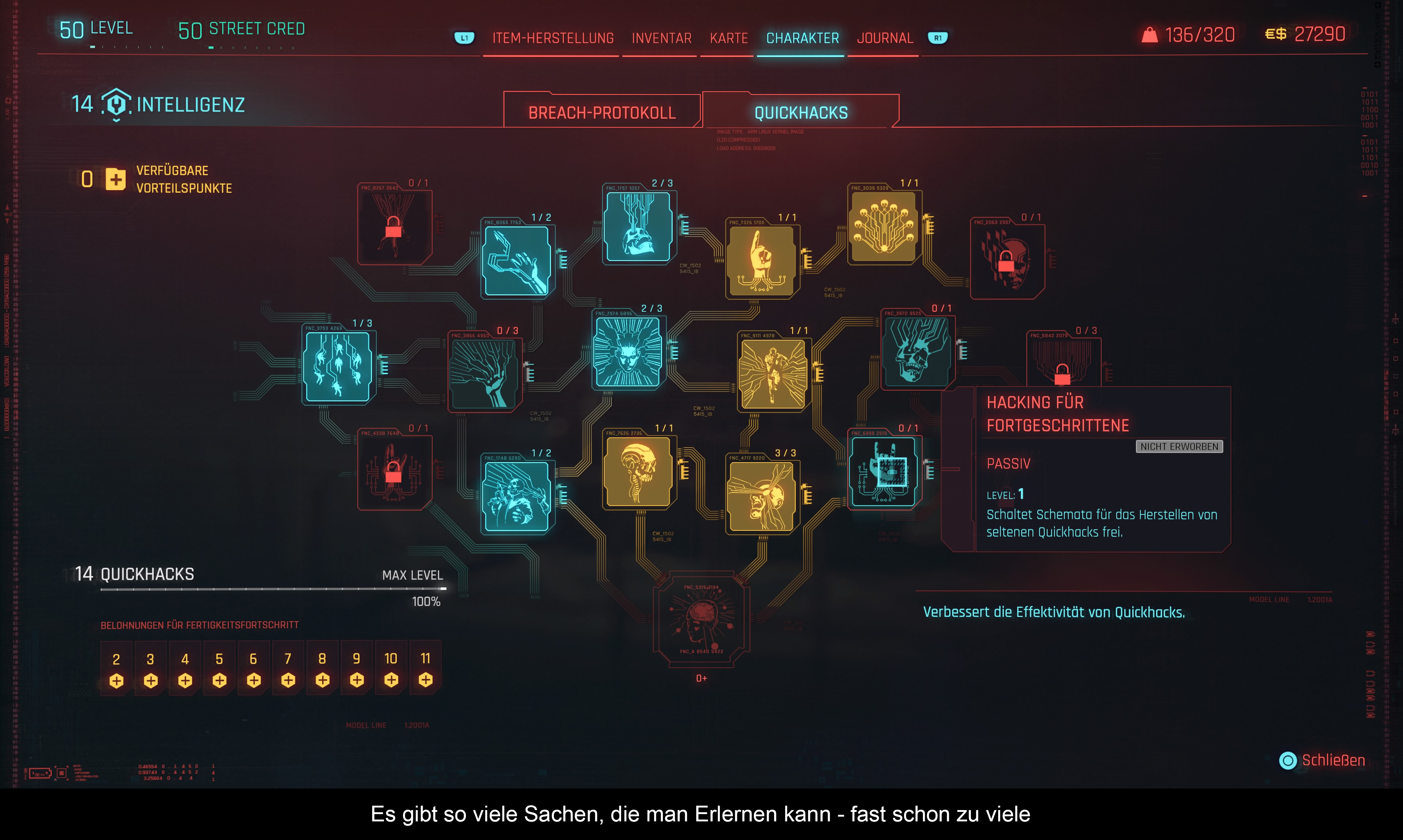 Was tut man in einer Mega-City? Vor allem, was tut man, wenn man nicht zu den privilegierten Einwohnern gehört? Man möchte zur Legende werden – sozusagen ein Vermächtnis hinterlassen. Und genau darum geht es hier auch. Nachdem man sich für eine Spielfigur (männlich / weiblich) entschieden und den Avatar von „V“ nach seinen Vorstellungen geformt hat, sucht man sich eine passende Herkunftsgeschichte aus und schon beginnt ein irrwitziges, emotionales und bombastisches Abenteuer in der Stadt der Städte. Die Hintergründe, die einem übrigens zur Auswahl stehen (wie z.B. Street Kid), sind eher kosmetischer Natur. Man bekommt ein paar zusätzliche Dialog-Optionen angeboten, aber ansonsten spielen sich alle Klassen praktisch gleich. Unterschiede machen die vielen Skill-Bäume mit den verzweigten Fertigkeiten, die man teilweise sogar mehrstufig ausbauen kann. Für meinen Geschmack hätten es auch ein paar weniger sein können, die dann klarere Typen-Profile vorweisen, so wird man von der Masse und dem Spezialisierungsgrad schlichtweg erschlagen.