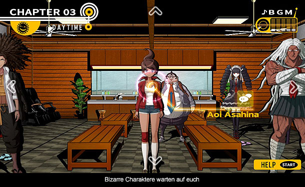 Spielerisch präsentiert sich „Danganronpa: Trigger Happy Havoc“ als klassisches Adventure. Man darf die Schule nach eigenem Belieben erkunden und dabei mit einem Cursor Dinge anvisieren und genauer begutachten. Großen Wert wird dabei auch auf die Interaktionen zwischen den Studenten gelegt, weswegen man mit allen immer wieder ein kurzes Gespräch halten darf, um die Charaktere besser kennenzulernen. Dabei ist jedes Kapitel des Spiels in insgesamt drei Teile unterteilt. Im ersten geht man seinem „normalen Studentenleben“ nach, erkundet die Schule und schließt Freundschaften. Irgendwann kommt es jedoch zu einem Mord und dann beginnt die Investigativarbeit. Es muss nämlich der Mörder gefunden werden und so untersucht ihr die Schauplätze der Morde und geht jeder Kleinigkeit nach, um so alle möglichen Beweise zu sammeln. Hat man diese zusammen beginnt die Verhandlung in der alle den Mörder finden und hier ändert sich das Gameplay doch etwas. Denn statt einfach nur die Kommentare der anderen auf Unstimmigkeiten hin zu überprüfen, kommen auch noch kleinere Geschicklichkeitseinlagen dazu. Beispielsweise muss man Anagramme lösen, darf ein Rhythmusspiel gewinnen oder aber wie in einem Zielschießen die falschen Kommentare mit seinen Beweisen zerstören. Dies bringt zwar etwas Abwechslung in den ansonsten recht nüchternen Spielablauf, sorgt aber auch für Frust, wenn man etwas nicht getroffen hat oder ähnliches und dadurch verliert, obwohl man die richtigen Schlüsse gezogen hat. Insgesamt erweist sich das Schlüsse ziehen manchmal als schwierig, weil viele Doppeldeutigkeiten vorhanden sind und manchmal endet das Spiel in Trial & Error.