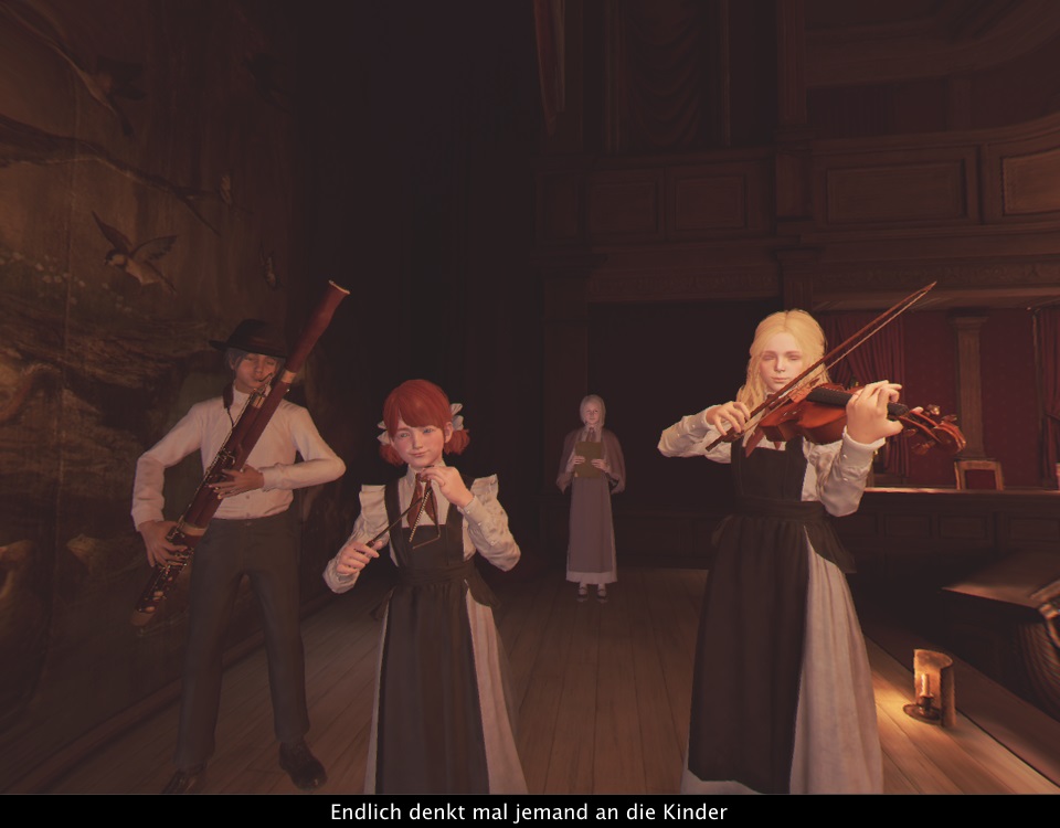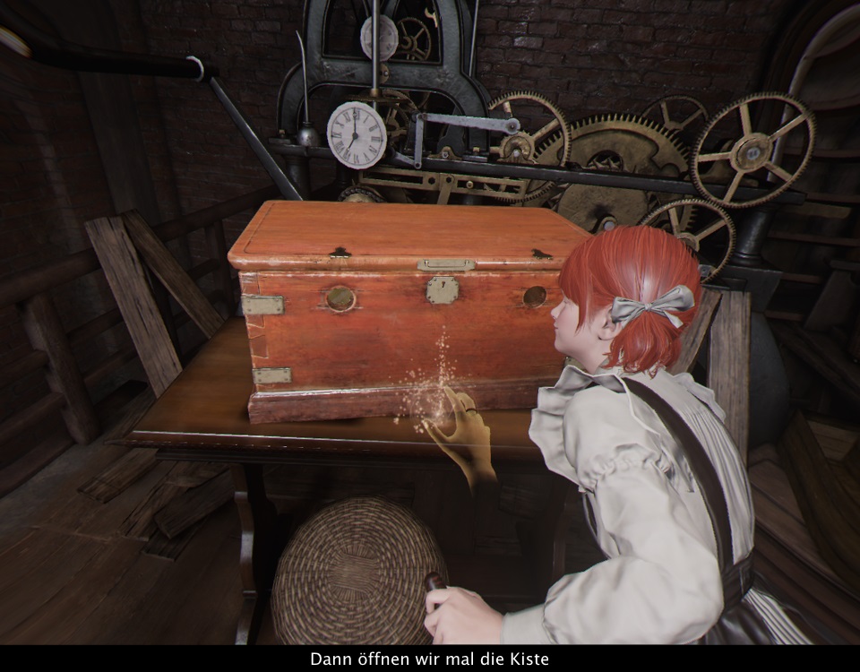 Sofort im Startbild fällt auf, dass die Grafik sehr aufwändig gestaltet ist. Die Umgebung und die Figuren sind hoch detailliert, die Auflösung ist für PSVR-Verhältnisse Top, die Texturen sind geschmackvoll und abwechslungsreich. Bloß wirkt es irgendwie nicht so recht lebendig. Das ist jetzt thematisch durchaus passend, da die meiste Zeit über die Zeit still steht, aber auch wenn die Figuren sich bewegen, wirken sie eher wie Animatronics als lebendige Menschen. Dieser Effekt wird vom Grafikstil begünstigt, da sie auch eher wie makellose Puppen aussehen. Die Geräuschkulisse ist eher schlicht, neben einfachen Soundeffekten gibt es einen atmosphärischen Soundtrack, der meist kaum auffällt. Bloß in einigen Schlüsselmomenten wird mit Anpassung der musikalischen Untermalung ein atmosphärischer Akzent gesetzt, was dann aber dadurch auch gut wirkt. Text und Sprache gibt es wahlweise auch komplett auf Deutsch, mit professionellen Sprechern.