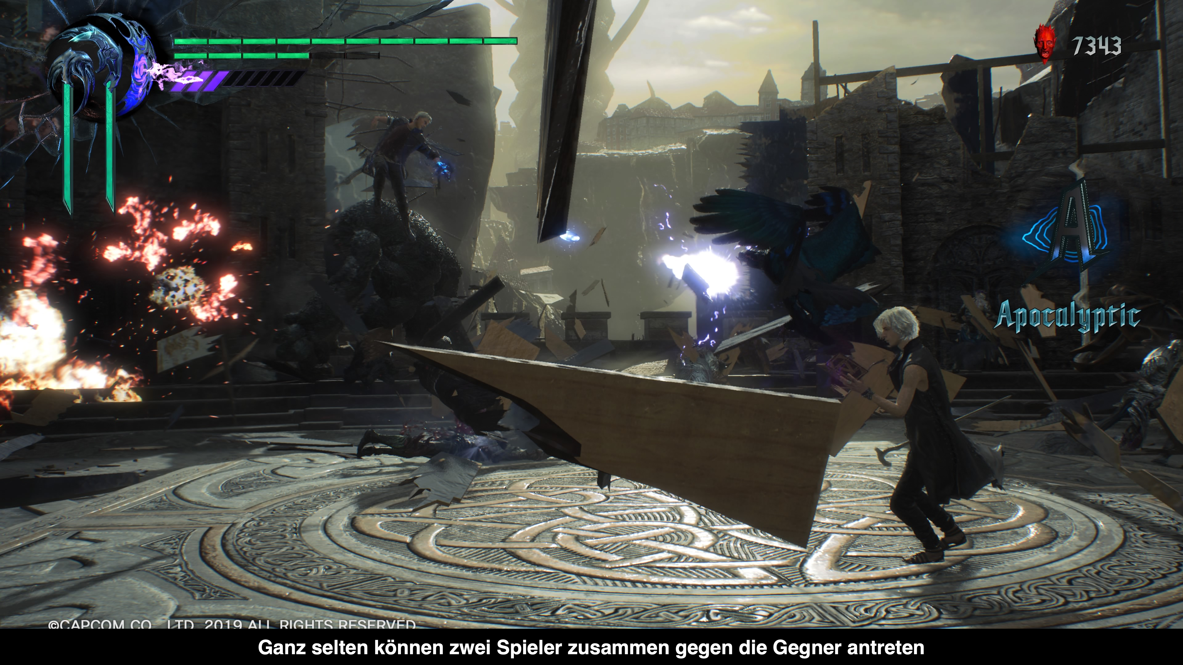 In eine völlig andere Kerbe schlägt nun aber der Charakter V. Statt wie Nero und Dante selber im Kampf aktiv zu werden, befehligt er drei Dämonen die an seiner Stelle kämpfen. Der Vogel Griffon ist quasi der Pistolen-Ersatz und der Panther Shadow kümmert sich um den Nahkampf. Mit einer ausreichend gefüllten Devil Trigger Anzeige kann dann noch das Ungetüm Nightmare gerufen werden, was mit den meisten Gegnern kurzen Prozess macht. Was auf dem Papier aber cool klingt, ist in der Praxis recht überladen. Das fängt schon bei der Steuerung an. Beide Kämpfer werden separat gesteuert und zumindest in der Standard-Steuerung sollte man einen trainierten Daumen haben, um die Quadrat-Taste gedrückt zu halten, während man die Dreiecks-Taste triggert. Glücklicherweise kann man die Steuerung ändern. Aber auch dann wird es nur bedingt besser, da es extrem schwer ist den Überblick in Kämpfen zu behalten. Ist Shadow nun nah genug um den Angriff zu nutzen? Ist der Angriff von Griffon schon aufgeladen? Und sich selbst muss man auch noch in Sicherheit bringen vor den Gegnern. Das führt meistens dazu, dass man in wahlloses Button-Mashing übergeht, was in Sachen Kombo-Meter am besten funktioniert. Mit keinem anderen Charakter ist es so einfach eine SSS Kombo zu machen, was den Sinn des ganzen Konzepts etwas ad absurdum führt.