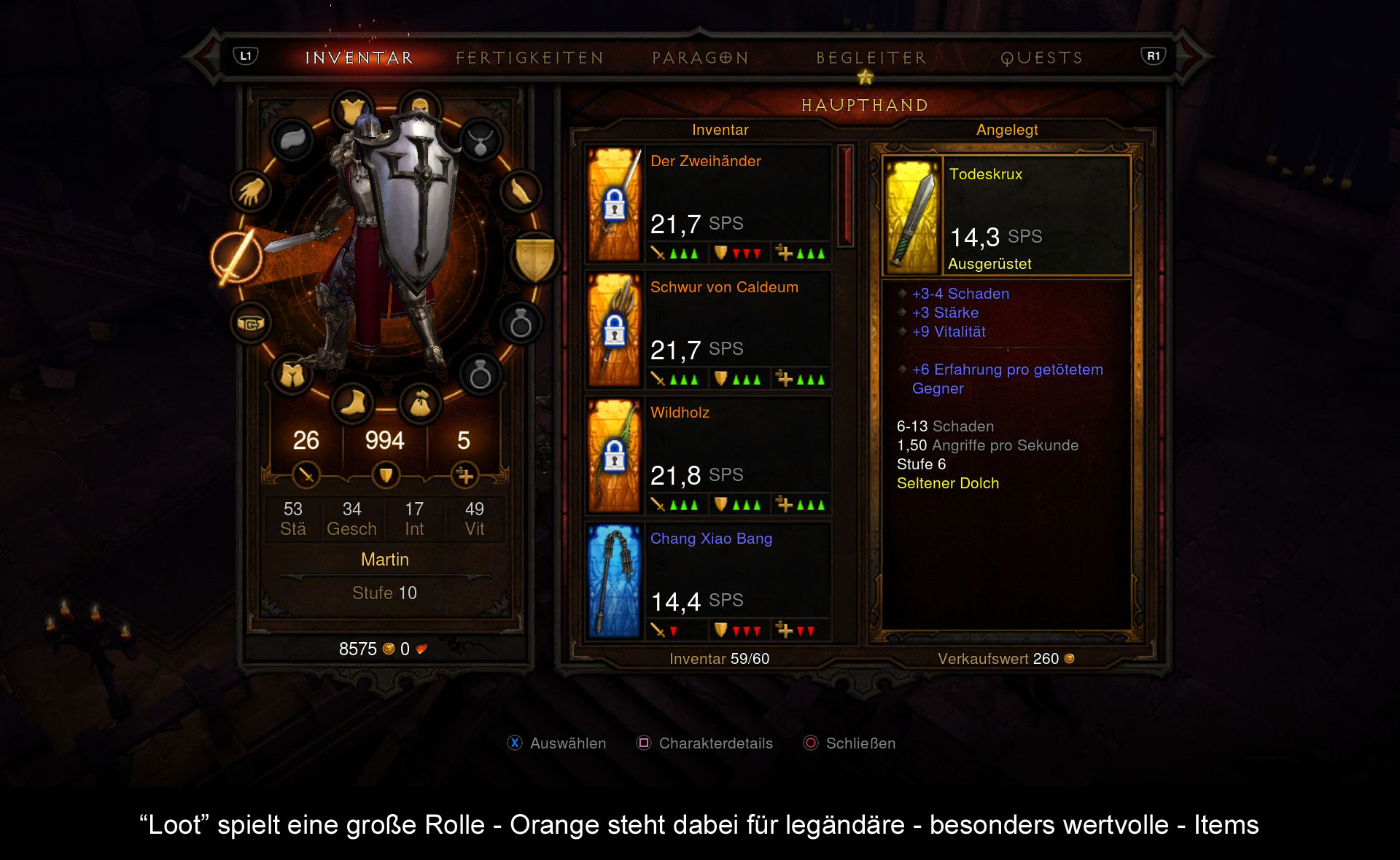 Im Gegensatz zu crack-king, habe ich den ersten Teil (damals auf dem PC) geliebt und ausgiebig gespielt. Der zweite Teil war dagegen nicht mehr so nach meinem Geschmack. Und Teil drei habe ich absichtlich auf der PS3 ausgelassen, als ich erfahren habe, dass Blizzard nicht mal eine HD-Auflösung hinbekommen hat. So genial sieht das Ganze nämlich nicht aus. Doch zurück zur PS4 Fassung. Diese läuft technisch einwandfrei in Full HD und mit stabilen 60 Bildern pro Sekunde. Über den Grafikstil lässt sich übrigens streiten. Mir sagt der Comicstil nicht ganz zu, da fehlt mir die düstere – teils horror-artige Atmosphäre des ersten Teils. Dafür setzt das Add-On „Reaper of Souls“ nahtlos an das Abenteuer an, wobei keines der beiden Enden auch nur ansatzweise befriedigt. Doch zurück zum Gameplay, das macht nach wie vor süchtig, vor allem, wenn man gleich einen Schwierigkeitsgrad höher spielt. Das Loot-System ist umfangreich und wird nach dem erstmaligen Durchspielen immer besser – Freunde können zwischenzeitlich helfen. Ob nun aktiv im Spiel oder passiv, via Item Geschenke. Auch spielen sich die vier Figuren unterschiedlich, so dass es Sinn macht, „Diablo 3“ mit anderen Klassen durch zu zocken. Was mir dagegen etwas fehlt, sind lange Dungeons und interessante Nebenauftrage (das machen andere Rollenspiele besser). Doch hier geht es ja primär um Action und die lässt nicht lange auf sich warten. Solo-Spieler können sich sogar KI Begleiter ins Boot holen, damit es nicht ganz so eintönig unterwegs wird. Ansonsten lockt das Spiel mit immer neuen Fertigkeiten, die dem Aufleveln den nötigen Pepp verleihen. Ergo, der Umfang stimmt, die Steuerung ist super und das Dämonenmetzeln macht vor allem Gaudi – ob alleine oder zu viert. Also: Worauf wartet ihr noch? Lasst uns Teufelsärsche kicken!