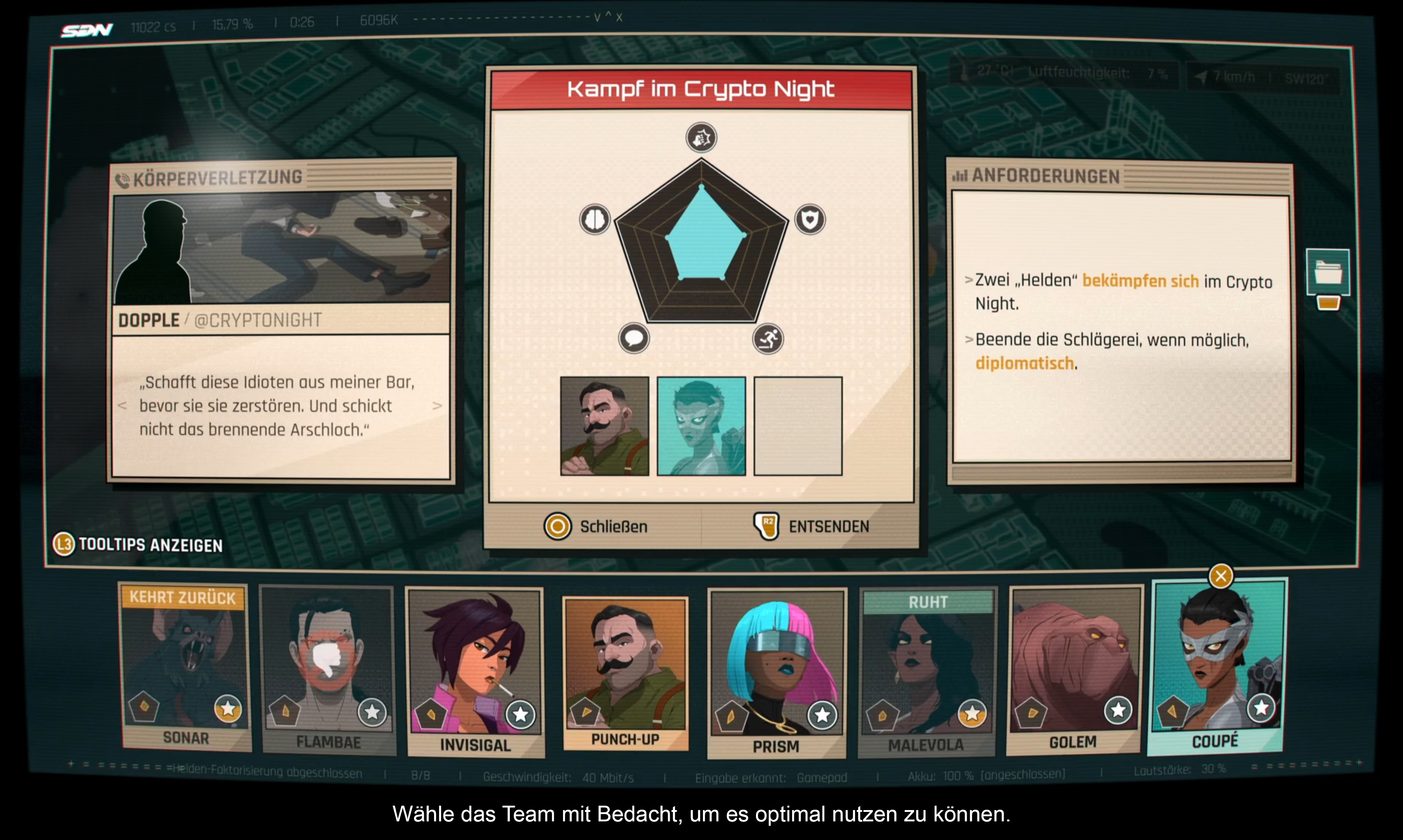 Was man vom Fall Telltale lernen konnte, ist, dass diese Art von Geschichten mehr Gameplaytiefe brauchen als reine Quick-Time-Events (QTE) oder das Auswählen von Dialogen. Der Kniff des Operators ist nicht nur erzählerisch schlau, sondern ermöglicht auch zusätzliches Gameplay. In seiner Tagesschicht als Operator für das SDN entsendet Robert sein Team auf Missionen. Je nach Charakter und Fähigkeiten können diese unterschiedlich erfolgreich sein. Die Aufgabe des Spielers ist es, den richtigen Helden zur richtigen Mission zu schicken.