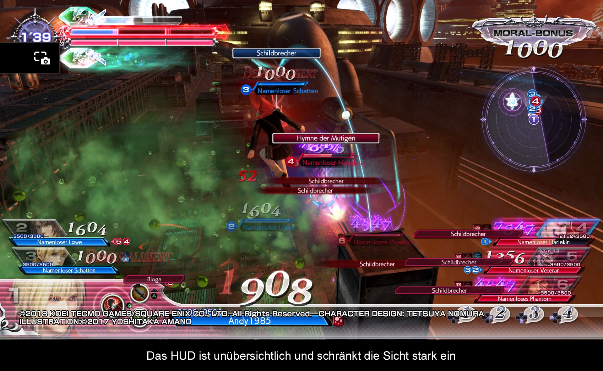Im eigentlichen Kampfgeschehen wird einem klar, dass man sich vom Vorgängern weit entfernt hat. Vorbei sind die Zeiten von Einzelkämpfen, nun wird zu dritt gegen drei Gegner in einer großen Arena gekämpft. Doch starten wir bei den Gemeinsamkeiten. Noch immer steht eine Vielzahl von Helden und Schurken zur Auswahl. Ob Zidane, Jecht, Sephiroth oder der Krieger des Lichts, die bekanntesten Figuren sind zurück. Dazu kommen neue Charaktere aus Final Fantasy XIV, XV, Tactics und Type-0. Leider wurden einige der neuen Charaktere aus Dissidia 012 gestrichen, doch geplanter DLC soll dieses Problem beheben. Alle diese Figuren wurden nun verschiedene Rollen zugeteilt, welche ihre besonderen Fähigkeiten beschränken und sie jeweils gegen eine andere Klasse verwundbar oder übermächtig machen. Leider kommuniziert das Spiel nicht, welche Rollen dies sind und welche Vorteile es dem Spieler bringt. Generell ist man mit Erklärungen sehr zurückhaltend und es wird dem Spieler überlassen es zu erahnen und zu erlernen. Aber nicht nur bei den Klassen hat man es als Neuling sehr schwer, auch beim eigentlichen Kampfsystem. Veteranen werden das Bravery System aus den Vorgängern kennen und sich gleich heimisch fühlen. Im Gegensatz zu vielen anderen Kampfspielen attackiert man in Dissidia die Lebenspunkte des Gegners nicht direkt. Im Kampf gilt es vor allem Bravery Punkte aufzubauen, was durch eine eigene Attacke ermöglicht wird. Sind diese Punkte höher als beim Feind, kann man mit seinem Lebenspunkteangriff zuschlagen. Der Unterschied zwischen den Punkten wird dem Widersacher dann von seinen Lebenspunkten abgezogen. Nach dem erfolgreichen Angriff verliert man ebenfalls die aufgebauten Punkte und wird für die Gegner zu einen schnellen Ziel. Klingt sehr verwirrend, doch nach ein paar Kämpfen versteht man das System. Neben direkten Attacken gibt es noch drei Ex-Angriffe. Zwei ermöglichen es einem seine Mitstreiter zu unterstützen oder für seine Gegner eine Falle zu legen. Dadurch kann man aktiv Angriff, Verteidigung und Bravery manipulieren und fördert das Gruppenbilden. Die dritte Ex-Attacke ist eine Spezial-Attacke der Figur. Alle drei Attacken haben einen Cool-Down und können nicht unbegrenzt eingesetzt werden. Zuletzt gibt es noch die mächtigen Esper. Im Kampf erscheinen immer wieder Kristalle, welche zerstört werden wollen. So füllt man über den Kampf hinweg die Esper-Leiste und beschwört einen der Sieben. Diese mächtigen Esper erscheinen direkt auf dem Kampffeld und hindern den Gegner bestimmte Manöver auszuführen und erhöhen vor und nach der Beschwörung verschiedene Fähigkeiten der Helden. Glücklicherweise sind diese keine übermächtigen Figuren, denn bei der Beschwörung ist man verwundbar!