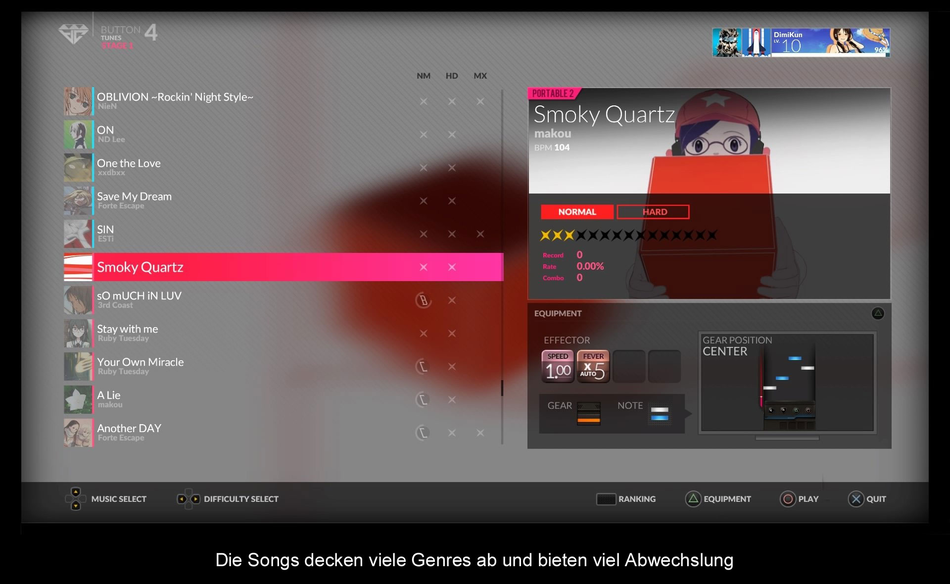DJMax Respect strotzt nur so vor Style. Sämtliche Menüs, angefangen vom minimalistischen Hauptmenü bis hin zu den farbenprächtigen Untermenüs, sind angenehm für das Auge und besitzen einen coolen Style, den nur wenige andere Spiele erreichen können. Darüber hinaus wurden die Musikvideos, die von den alten PSP Titel stammen und jeweils im Hintergrund laufen, nun auf 1080p aktualisiert. Jedes Lied verfügt über ein eigenes Video. Die Stilart unterscheidet sich dabei von knuffigen Anime-Videos bis hin zu coolen Jazz-Clips. Und auch die Musik von DJMax Respect zeichnet sich durch eine enorme Vielfalt aus, die von koreanischen Pop-Songs über harte Metal-Lieder bis hin zu bombastischen Elektro-Sounds eine Vielzahl an Stilrichtungen umfasst. Mir persönlich hat der Mix beispielsweise deutlich besser gefallen, als die Songs beim letzten Hatsune Miku Spiel, welches ja eine ähnliche Kerbe einschlägt, da die dortigen Lieder für meinen Geschmack doch etwas zu schräg waren. Die Tracks von DJ Max Respect hingegen sind catchy und gehen schnell ins Ohr.