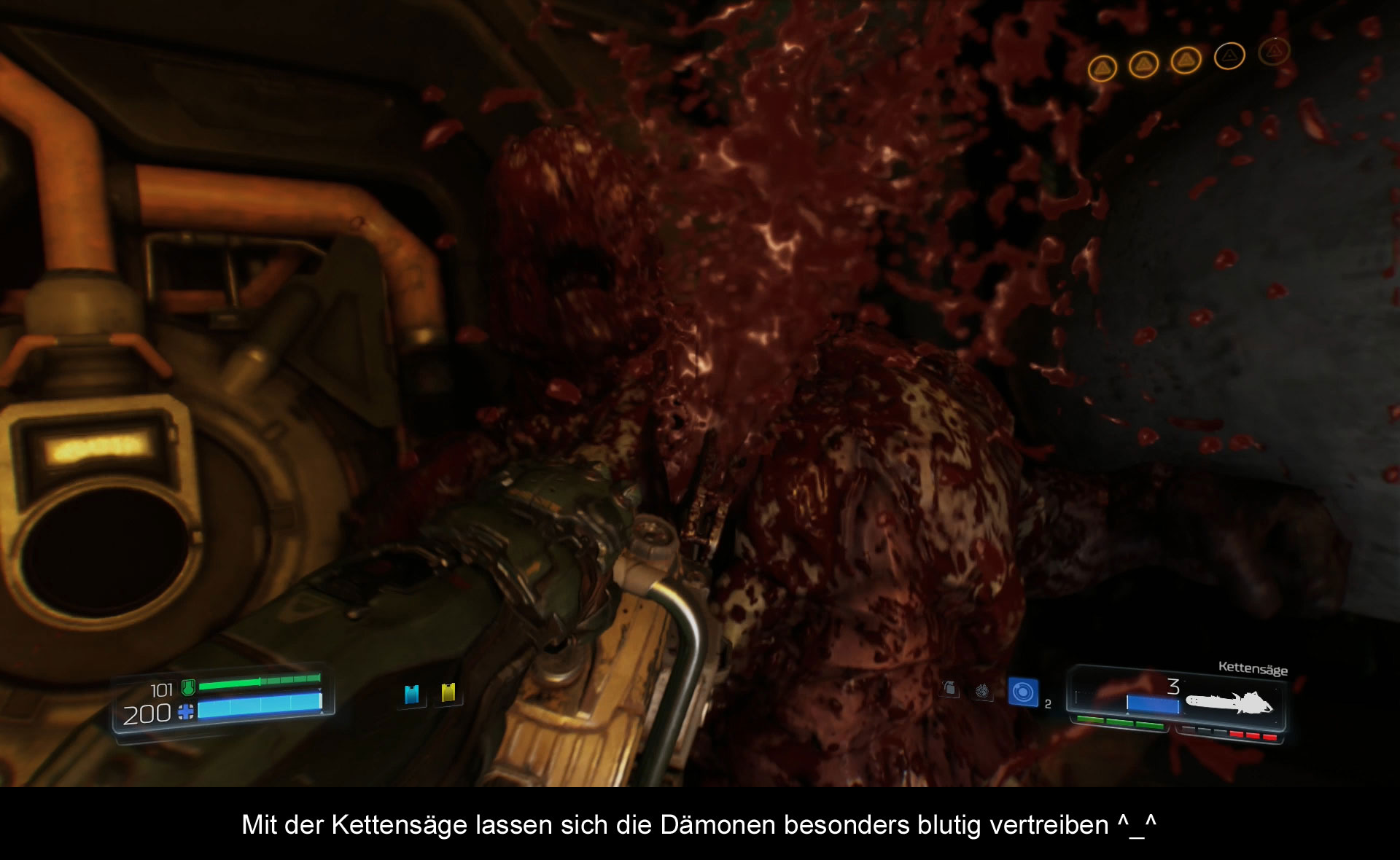 Ganz einfach: man nutzt die Glory-Kill. Die schwerverletzte Gegner blinken Orange und können mit einem Finisher hingerichtet werden, und wenn man dies tut, kriegt man mehr Gesundheit wieder und mit der richtigen Rune sogar Panzerung. Wer sich jetzt fragt, ob man die besonders großen Dämonen auch per Glory-Kill erledigen kann, der kann beruhigt aufatmen, denn man kann alles per Glory-Kill umhauen und so spielt sich DOOM dann auch. Man ist nicht der kleine Soldat, welcher gegen einen übermächtigen Gegner in den Krieg zieht und diesen mit krassen Story-Twists und Verbündeten gewinnt. Nein, wir spielen den DOOM-Marine, welcher allein alle Verdammten in der Hölle vernichtet und so fühlt sich das Gameplay auch an.