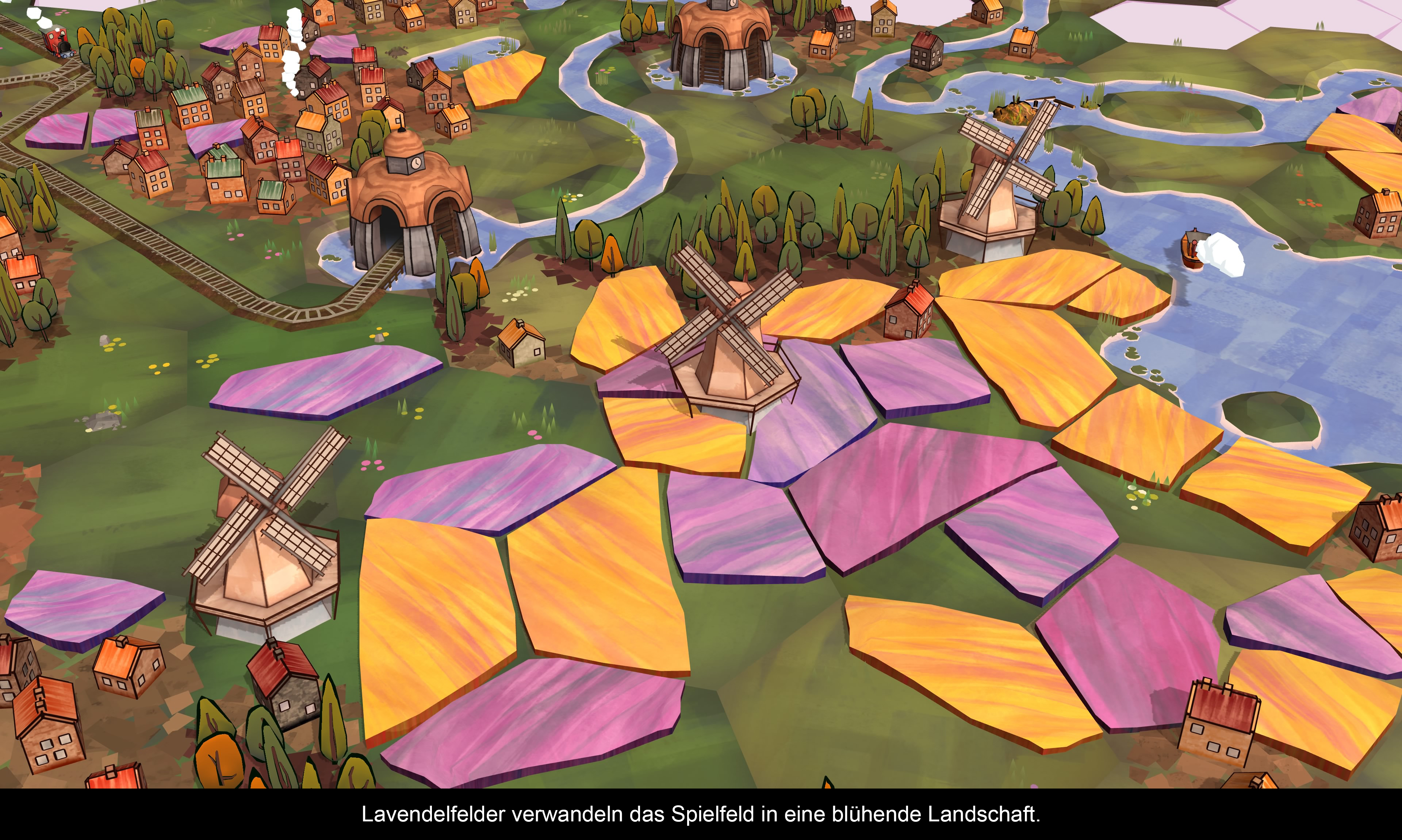 Ihr beginnt mit einem Sechseck, das eine grüne Wiese darstellt. Rechts daneben findet ihr einen Stapel weiterer sechseckiger Plättchen. Hier zieht ihr immer das nächste Element und platziert es in der Landschaft. Jedes Sechseck kann verschiedene Biome zeigen, die sich aus Wäldern, Häusern, Feldern, Bahngleisen, Gewässern und Wiesen zusammensetzen. Entsprechend werden die Felder aneinandergelegt und ihr erhaltet Punkte. Je mehr passende Felder das Plättchen hat, desto mehr Punkte gibt es. Soweit der einfache Teil. Einige Felder haben jedoch Quests, die es zu erfüllen gilt. Dafür müssen mehrere solcher Biome verbunden werden. Jeder erfüllte Auftrag oder jedes perfekt platzierte Plättchen gibt ein weiteres Plättchen in den Stapel zurück und verlängert somit das Spiel. Das Spiel ist zu Ende, wenn alle Sechsecke im Stapel platziert wurden.