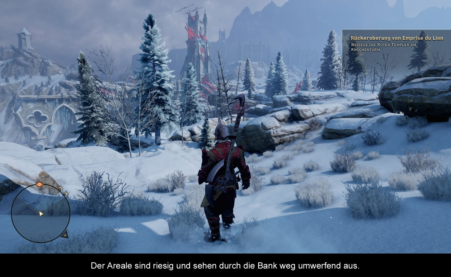 Wo fängt man am besten bei dieser gewaltigen Anzahl von Quest an? Vielleicht bei schnellen und einfachen Aufgaben? In der ganzen Welt gilt es Materialien zu sammeln und Pflanzen zu pflücken. Das sollte man auch regelmäßig tun, da man dadurch seltene Ausrüstungsgegenstände und Tränke herstellen kann. Vorausgesetzt ihr habt die notwenige Anleitung. Diese Baupläne gibt es oft als Questbelohnungen, wenn ihr den verschollenen Gatten einer Bäuerin findet, einen Soldaten aus einer brenzligen Situation befreit, oder einfach nur Vorräte sichert. Auch das Schließen der Dämonenportale sollte man nicht vergessen, denn diese sind zahlreich in den Landen verstreut. Vorsicht, es gibt keine genaue Angabe, was für Dämonen aus diesem Portal entschlüpfen und ob eure Truppe dafür gerüstet ist. Sollte man doch unterliegen, kann man sich zur Entspannung auf die Suche nach Sternwarten machen und die Gestirne deuten. Wer noch mehr will, sollte nach einen Totenkopf ausschauhalten. Mit ihm markiert man Splitter, die überall verstreut sind und darauf warten, eingesammelt zu werden. Kurzum, es gibt viel Kleinkram zu erledigen, doch die interessanten Nebenaufgaben sind die privaten Quests der Mitstreiter. Wer wollte nicht schon immer wissen, warum Varrics Armbrust Bianca heißt? Tja und Drachen? Die streunen in der Gegend herum und warten nur darauf, niedergestreckt zu werden! Deckt euch ordentlich mit Heiltränken ein und überlegt eine gute Taktik, denn diese Herausforderungen sind nur etwas für erfahrene Recken! Wer bis dahin das Kampfsystem nicht innehat, zieht schnell den Kürzeren! Wo wir auch schon beim nächsten Schwerpunkt wären!
